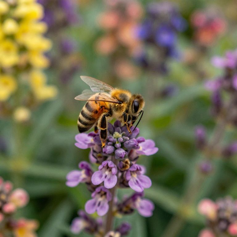 Photograph of a buzzing honeybee with yellow and black stripes, perched on a cluster of vibrant purple flowers, surrounded by colorful, blurred blossoms