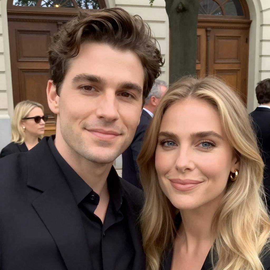 Photograph of a smiling couple. Blonde woman with short bob, strapless black dress, small gold necklace, light skin. Man with short brown hair, white button-up shirt, light skin. Background has dim lighting, blurred people, and colorful decor. Woman looks at man, man looks at woman. Both stand close, arms around each other's waist.