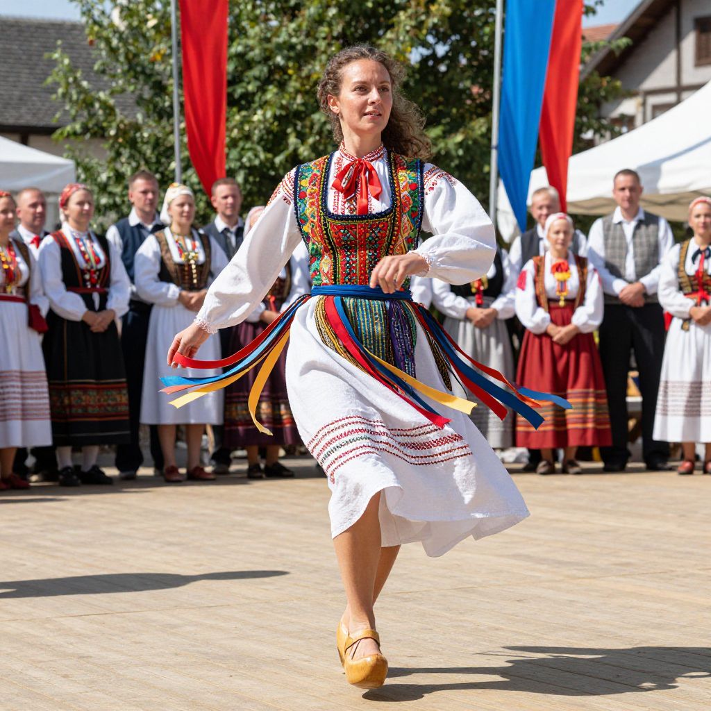 A Polish folk dancer in her mid-30s with warm brown eyes, fair skin, and a curly brunette hairstyle, wearing a traditional wooden clog and a vibrant colorful vest with flowing ribbons that sway in the wind, standing on a wooden dance floor in a sunlit village square during a folk festival, surrounded by local villagers in period costumes, bright red and blue banners in the background, realistic photography style