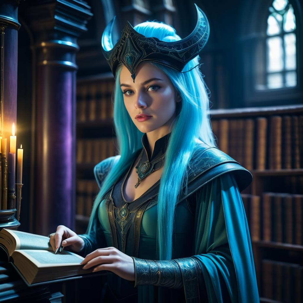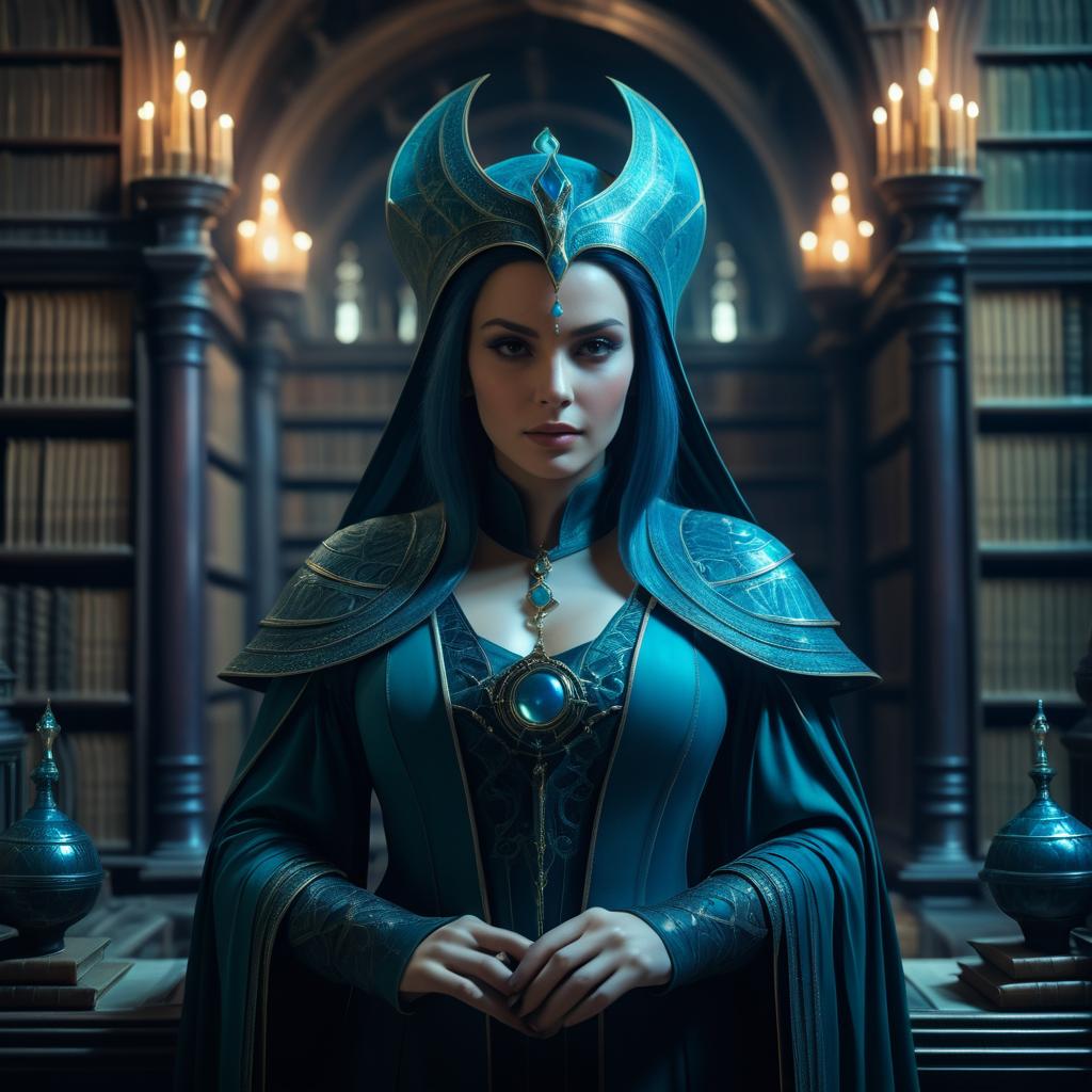 Close-up portrait of a mysterious sorceress dressed in ornate blue armor and a ceremonial headdress, standing in an ancient library filled with old books and candlelight. The scene features serene colors and cinematic lighting, creating a moody and mystical atmosphere.
