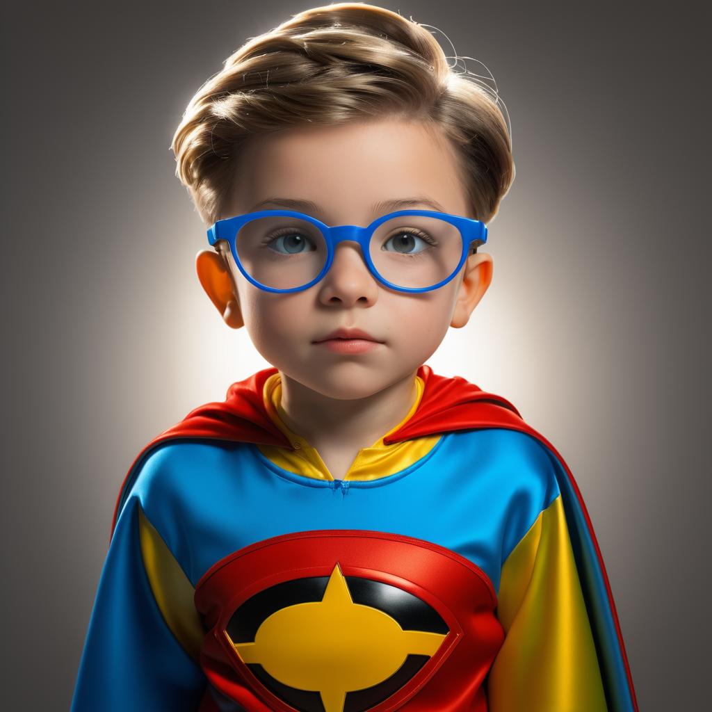 Close-up portrait of a young boy with light brown hair and blue eyes wearing large round blue glasses. He is dressed in a superhero costume featuring a blue shirt with a red and yellow emblem and a red cape. The image is hyperrealistic with volumetric lighting highlighting the boy's soft facial features against a dark background.