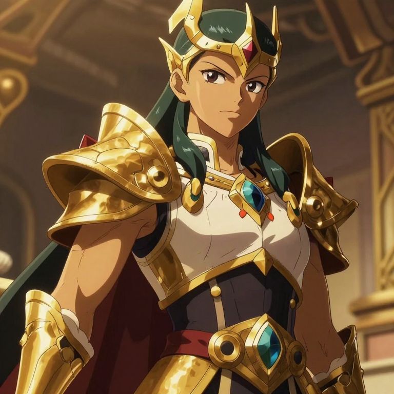 A detailed fantasy anime character with olive skin, wearing ornate armor and a golden headpiece, exudes a commanding presence.