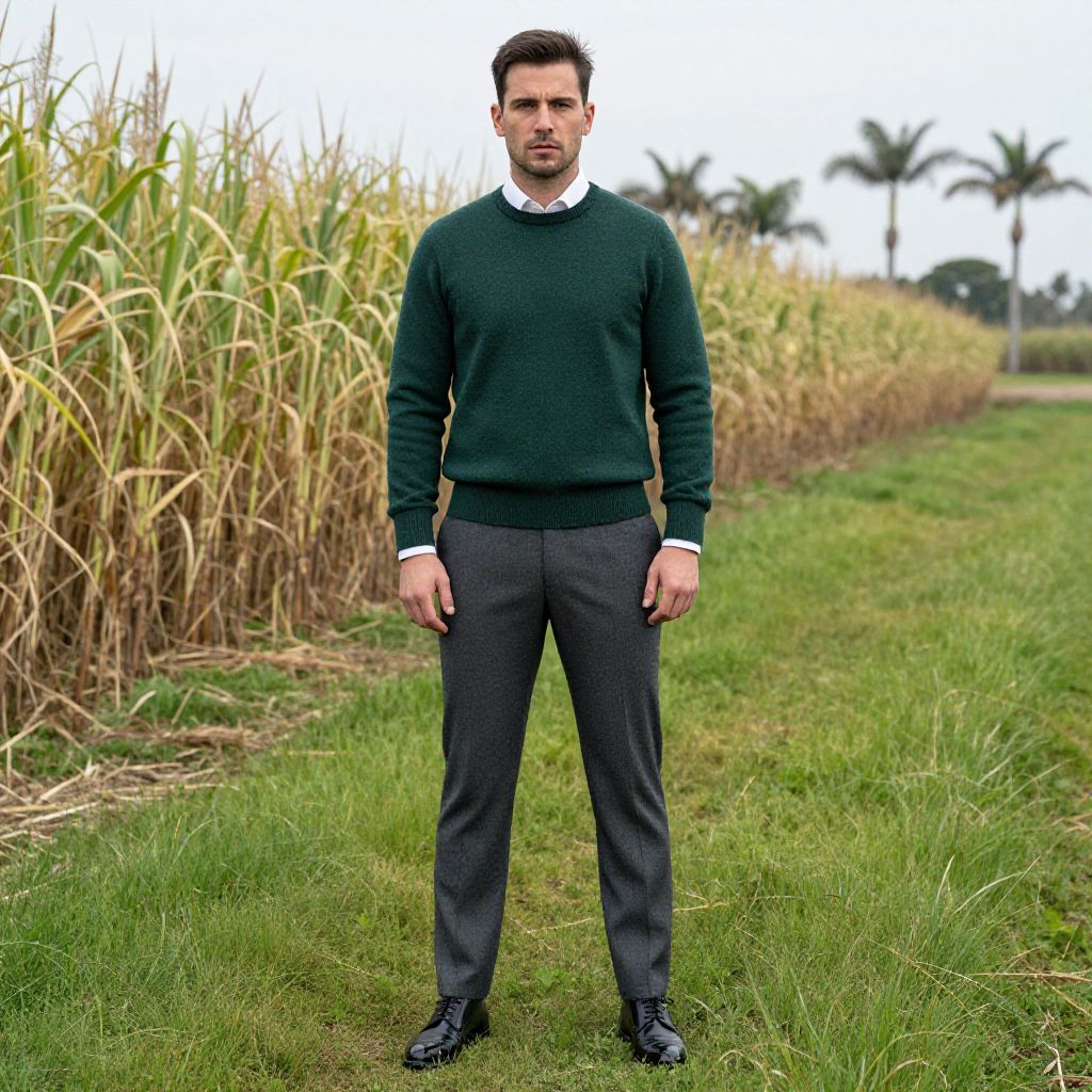 A man, business casual attire, tailored charcoal wool trousers, crisp white dress shirt, deep green merino wool sweater, black oxford shoes, polished finish, lush green fields, rows of tall sugarcane, distant palm trees swaying, cinecolor, confident expression. Man has masculine face and piercing eyes