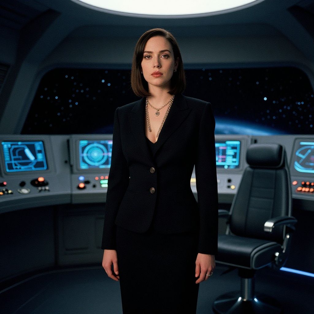 Photograph of a serious, dark-haired woman in a black suit standing in a futuristic spaceship control room with illuminated screens.