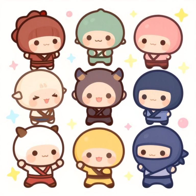 Chibi-style digital drawing of nine cute, round-headed characters in various ninja outfits, with colorful backgrounds and sparkles.