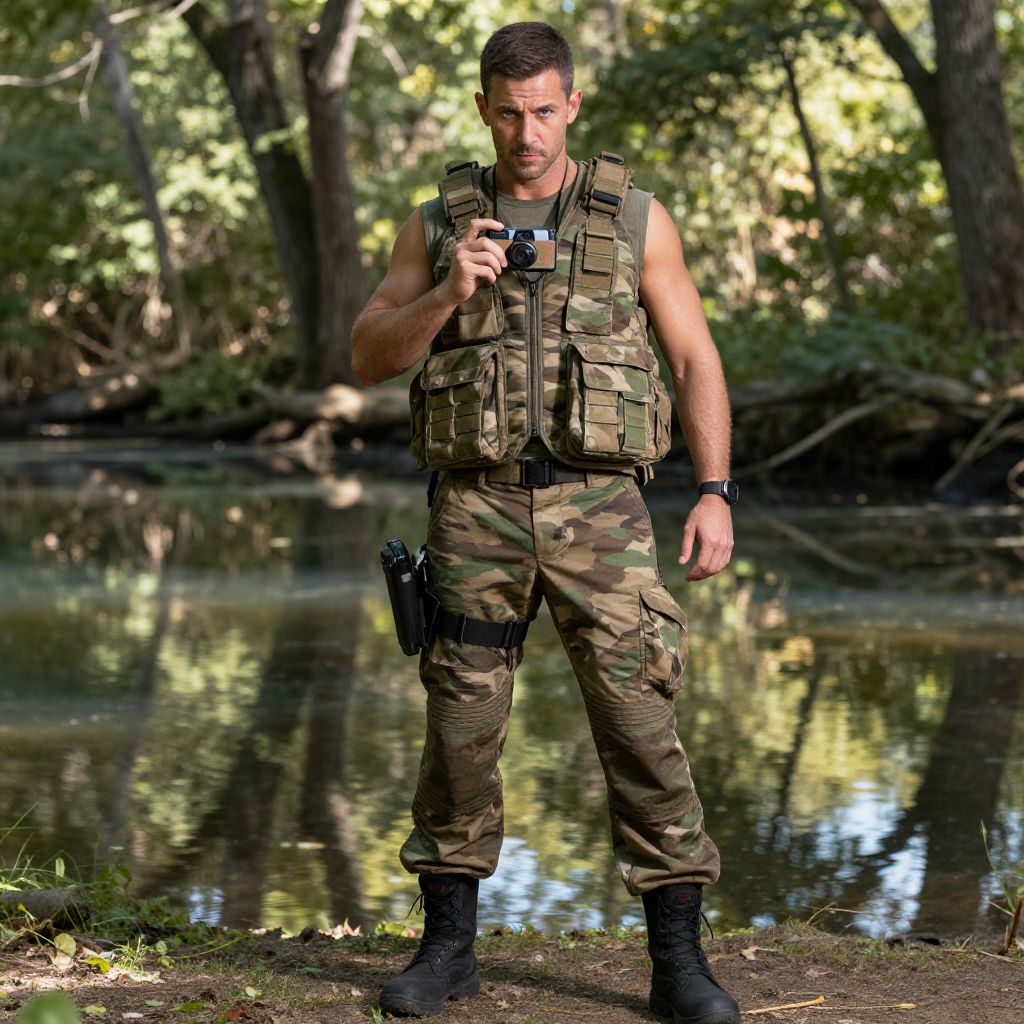 A man, camouflage hunting vest, tactical pants, combat boots, standing by a reflective pond, disposable camera style, focused expression, sunlight filtering through trees. Man has masculine face and piercing eyes