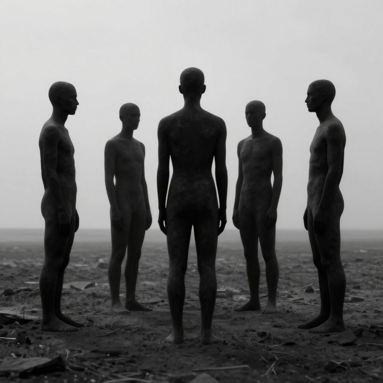 In a desolate expanse where echoes fade into silence, shadowless figures stand as living sculptures, their forms whispering the weight of solitude and the eternal quest for connection.