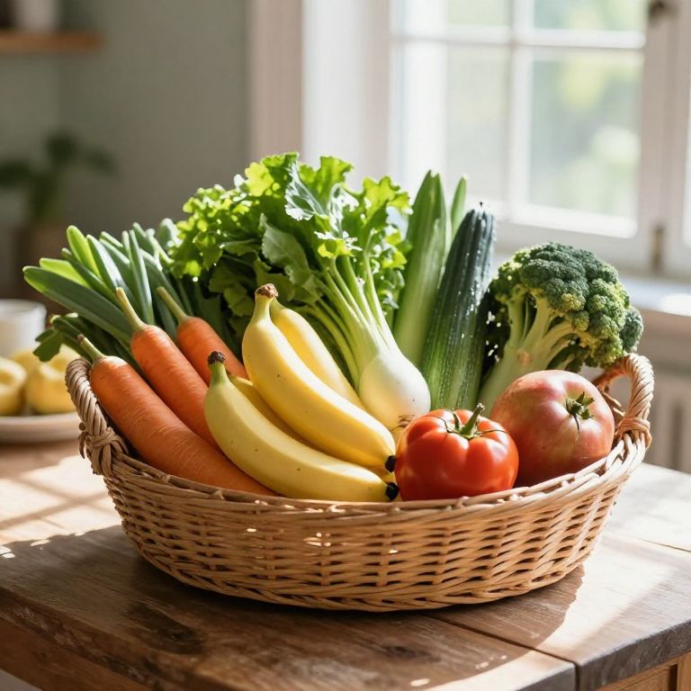 Bundled fresh fruits and vegetables arranged in a woven basket, rustic farmhouse table setting, morning sunlight streaming through window, bright and natural colors, detailed textures, wholesome and inviting atmosphere