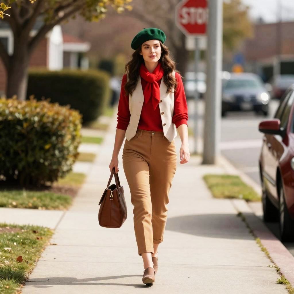 Woman walking down a sunlit suburban sidewalk, wearing a green beret, red scarf, beige vest, red shirt, and tan pants. She has long brown hair, light skin, and is carrying a brown bag. Trees and bushes line the path. A red car is partially visible on the right. "Stop" sign in the background.