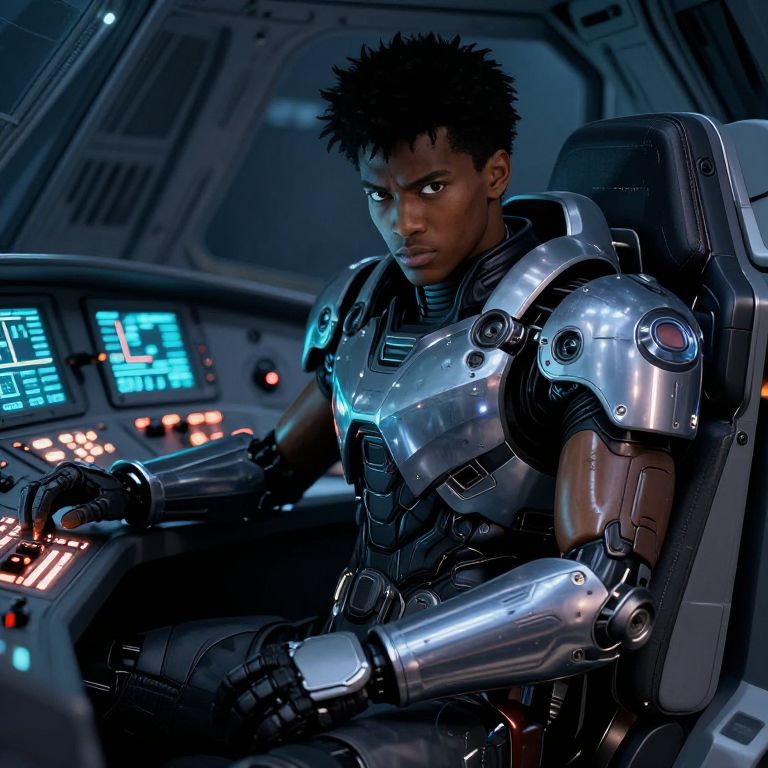 Black anime dude in futuristic mech pilot suit inside a spaceship cockpit, control panels glowing, determined expression, cinematic lighting, detailed mechanical designs and reflective surfaces