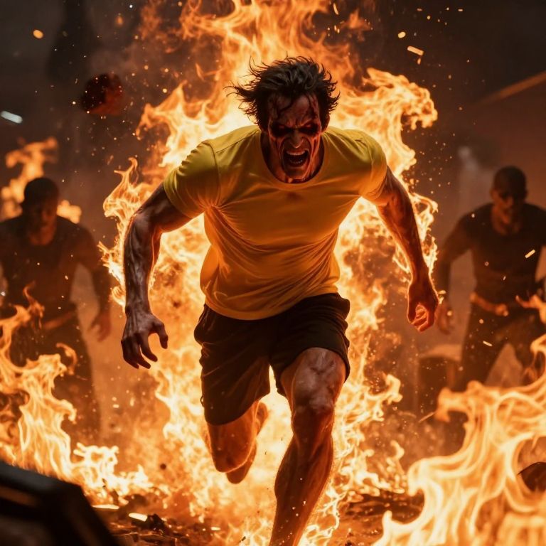 In this dynamic and intense image, a figure with a muscular build is depicted running forward, exuding a sense of urgency and power. The figure's face is a grotesque, demonic visage, with glowing red eyes and a menacing expression, adding a sense of horror and danger to the scene. The figure is adorned with a simple, form-fitting yellow shirt and black shorts, highlighting their athletic form. Surrounding the figure is a fierce, fiery inferno, with bright orange and yellow flames engulfing the space, creating a dramatic and chaotic atmosphere. The flames seem to be emanating from the figure, further emphasizing their power and the intensity of the scene. In the background, silhouettes of other figures can be seen, adding to the sense of chaos and conflict. The overall composition is tightly framed, drawing the viewer's attention to the central figure and the fiery backdrop, creating a powerful and unsettling visual experience.