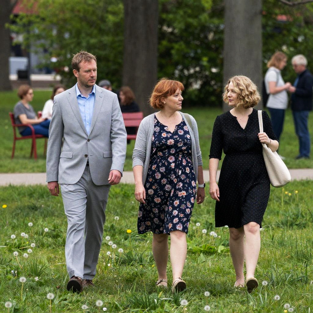 Photograph of three people walking in a grassy park. Man in light gray suit, woman in floral dress and gray cardigan, woman in black dress with polka dots holding beige bag. Background: people sitting at red chairs, standing, trees. Green grass, dandelions. Casual, relaxed atmosphere.