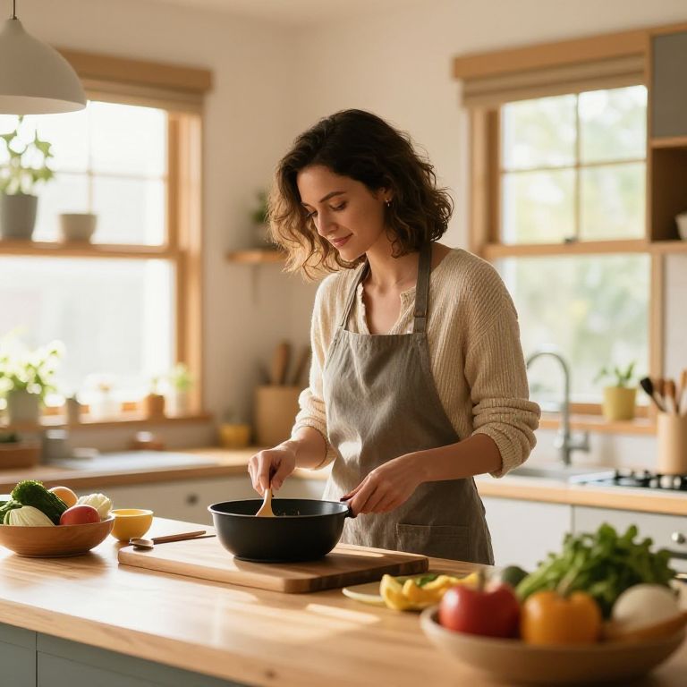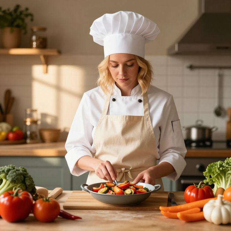 Blonde chef ratatouille in a rustic French kitchen, vibrant vegetables surrounding her, wearing a classic chef hat and apron, soft natural light casting warm shadows.