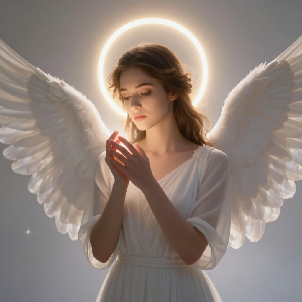 Digital artwork of a beautiful angelic woman with glowing halo, white dress, and large feathered wings, praying against a dark, ethereal background.