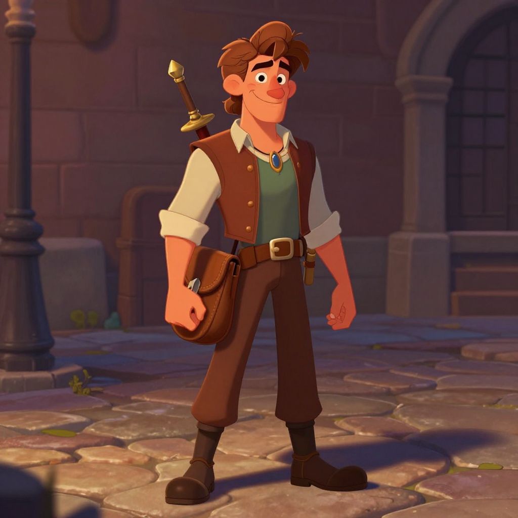 Flynn Rider full body digital painting, stylized animation character, confident smirk, holding a satchel and dagger, standing on cobblestone street, rich color palette, dramatic lighting