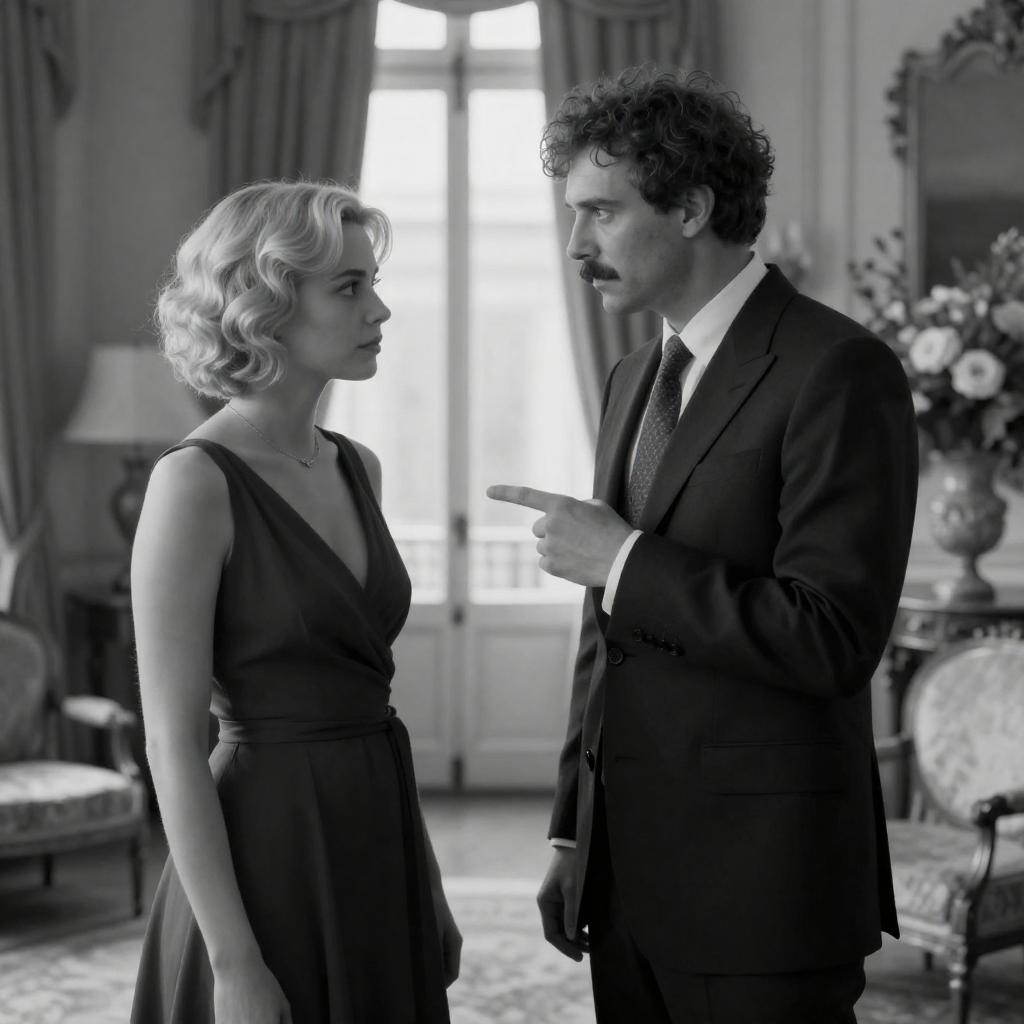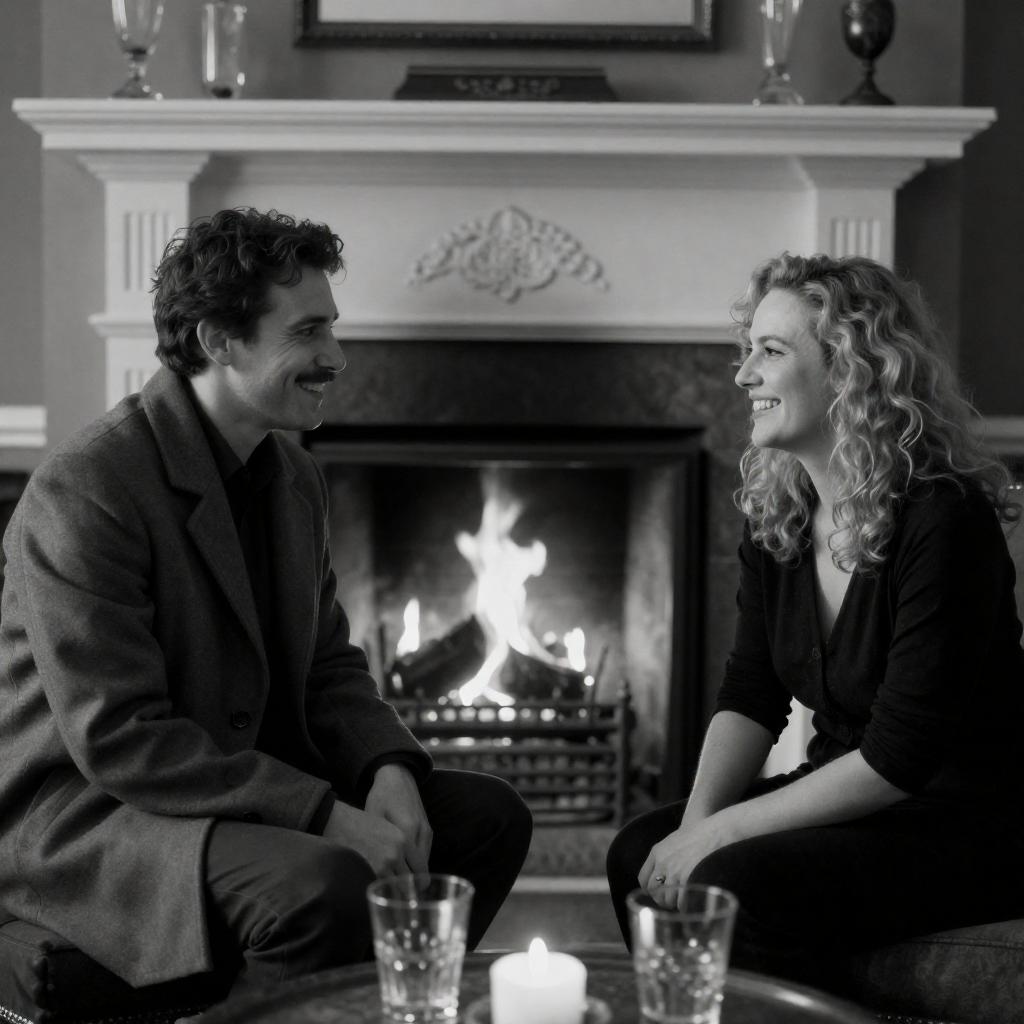 Black-and-white photograph of a man and woman sitting opposite each other in front of a fireplace with a lit fire. Man has dark hair, mustache, wears a coat; woman has curled blonde hair, wears a dark top. Both smile. Fireplace has decorative mantel, glass objects on top. Man on left, woman on right. Table with glassware and candles in foreground. Intimate setting.
