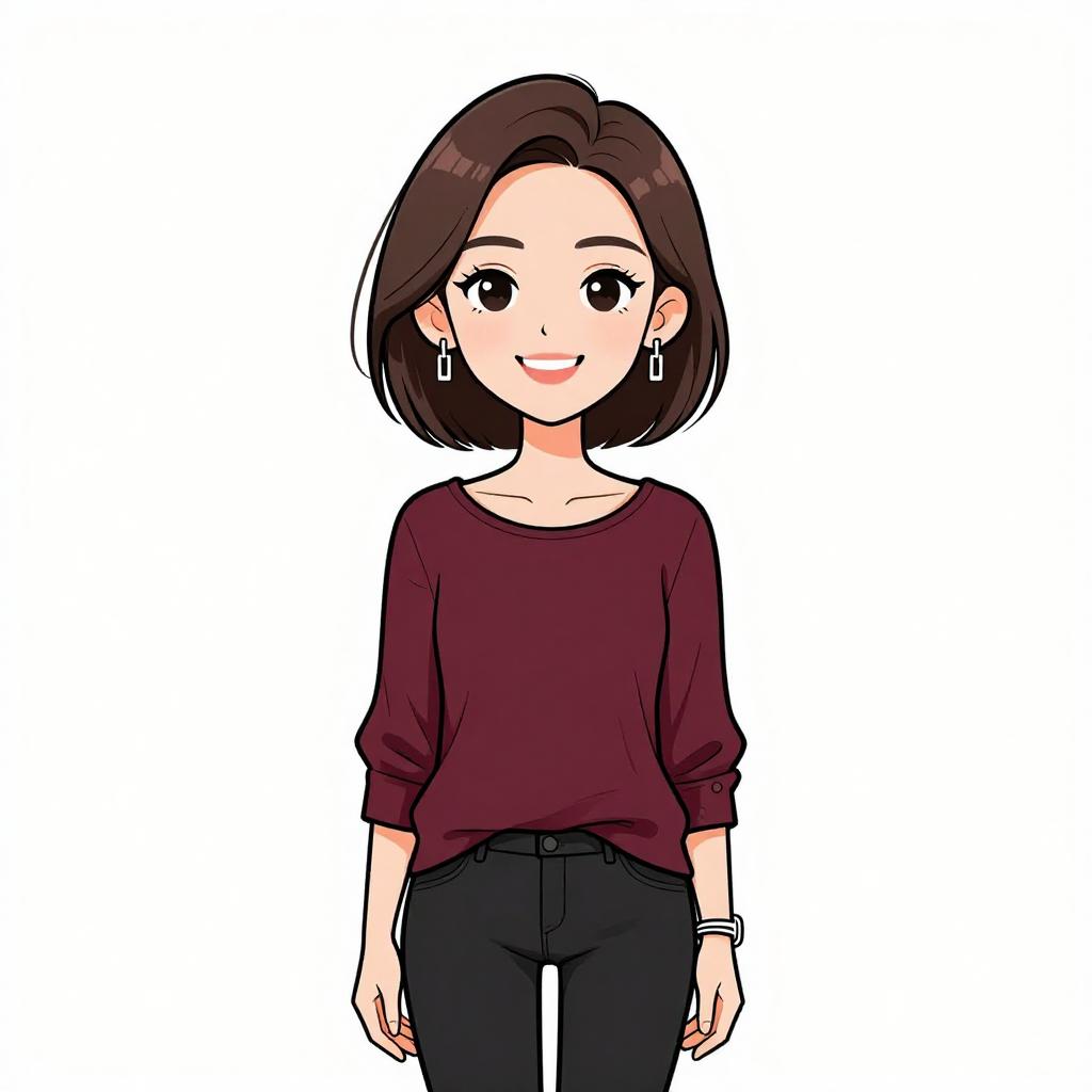 Woman with pretty face and pretty hair. smiling Woman, casual, solid burgundy long-sleeved blouse, bateau neckline, cuffed sleeves with button details, black skinny pants, silver drop earrings, bracelet on each wrist. --sref 1467