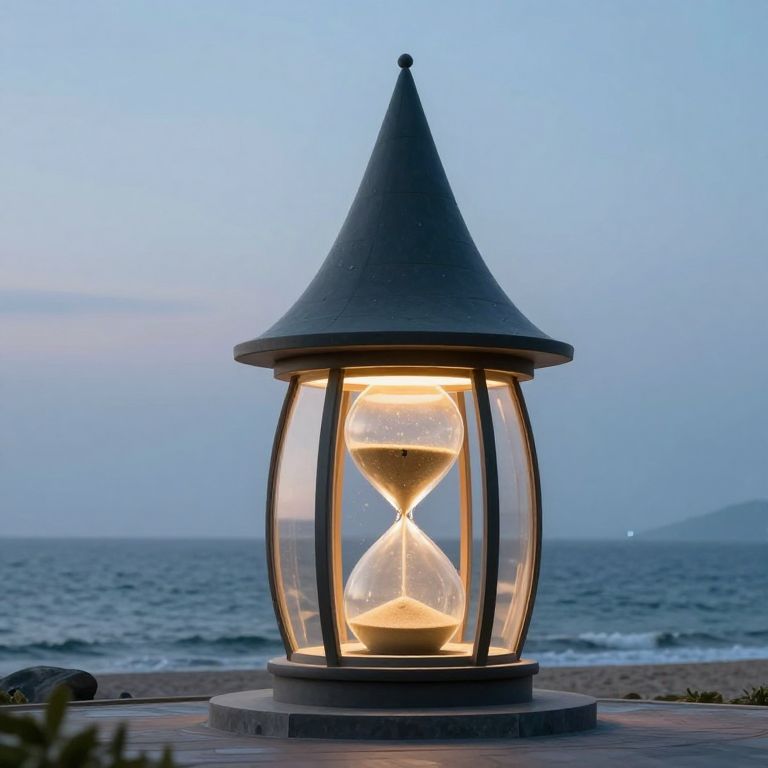 A teardrop-shaped clock tower stands serenely by the sea, its sides adorned with glowing hourglasses that catch the cascading sands of time, defying gravity as they pool sideways into the walls.