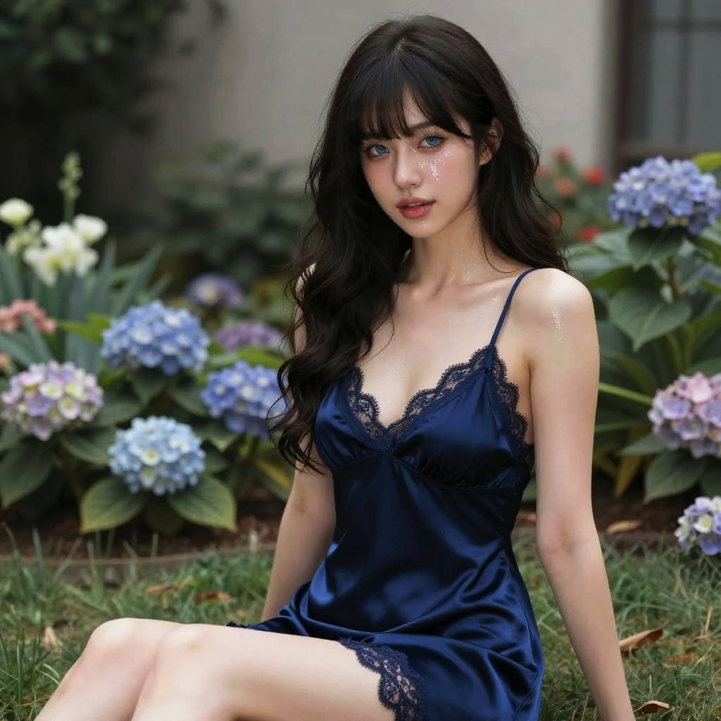 Photo-realistic image of a young East Asian woman sitting outdoors in a flower garden. She has long, strong wavy black hair with blunt bangs, styled loosely with a silk scrunchie. Her striking blue eyes and moist skin are highlighted by cinematic lighting. The woman wears a luxurious midnight blue silk nightgown with delicate lace trim along the V-neckline and hem, supported by thin, adjustable spaghetti straps. The background features hydrangea flowers in shades of purple, blue, and white.