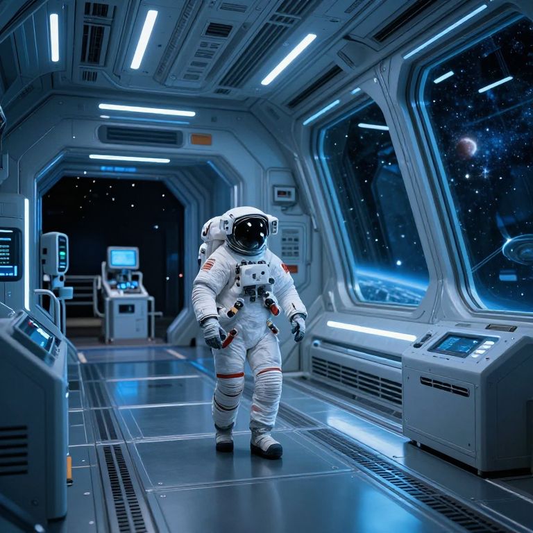 An astronaut guided through a futuristic space station, sleek metallic corridors illuminated by neon blue lights, vast windows showing distant galaxies, high-tech equipment surrounding, sci-fi concept art with cinematic lighting effects.