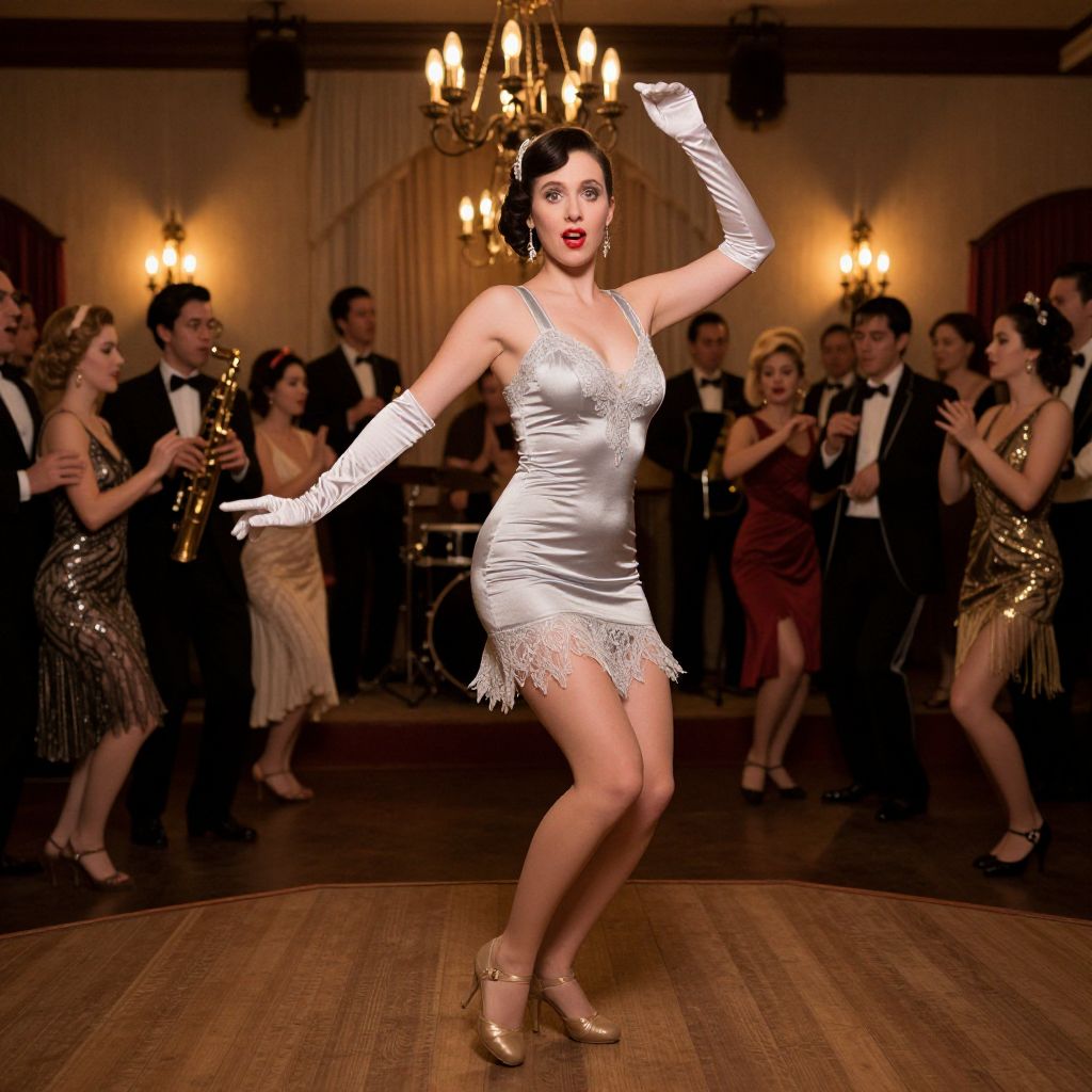 A dynamic flapper in her mid-20s with fair skin, large expressive eyes, and a bold red lip stain, wearing a tight toe-tapping flapper costume with a plunging neckline, silver lace trim, and long gloves, standing on a wooden platform at a vintage dance hall, surrounded by a crowd of similarly dressed women, with a band playing swing music and the glow of incandescent lights casting soft shadows.