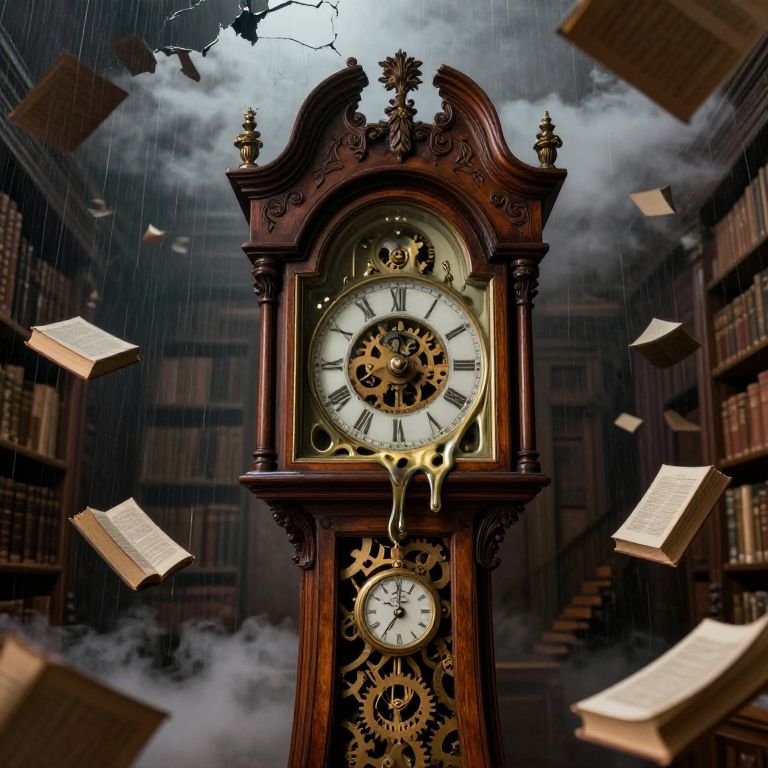 An antique grandfather clock stands sentinel in an ancient library, its wooden surface etched with intricate carvings of clocks within clocks. The clockface appears to be melting, gears and cogs exposed in an almost organic tangle. This enigmatic scene blends elements of time, nature, and the mysterious, evoking both curiosity and unease in a dreamscape filled with floating books forming clouds, and a soft glow from misty rain seeping through cracks in the ceiling. The artistic approach is reminiscent of surrealist paintings, inviting viewers to ponder the intricate tapestry of reality and imagination.