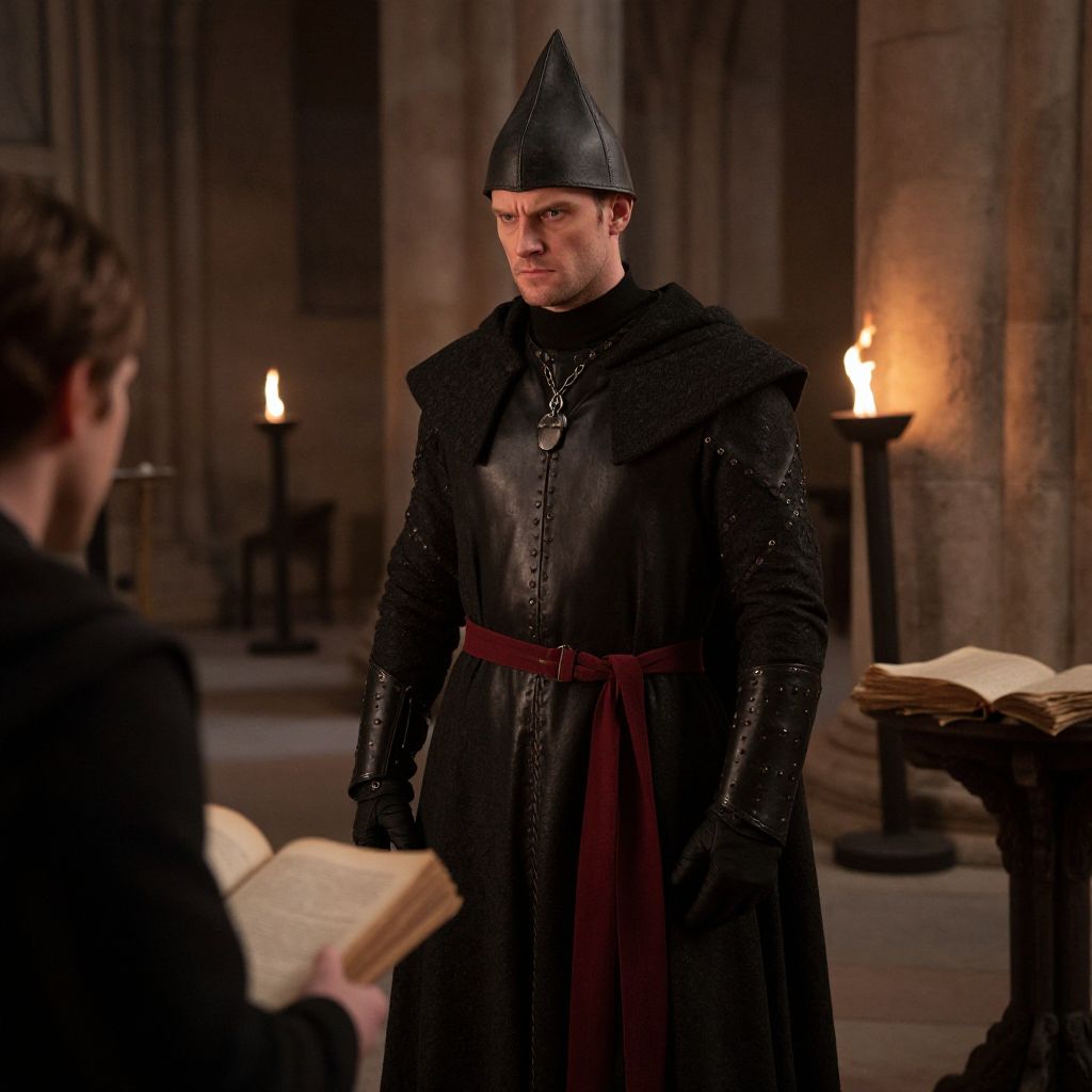 A realistic photograph of a tall, intense man in an inquisitor costume, wearing a dark, pointed hat, leather armor, and a long black robe with a crimson sash, standing in a dimly lit medieval cathedral filled with torches and old manuscripts, his face stern and focused, eyes narrowing as he turns to look at a nearby accused person.