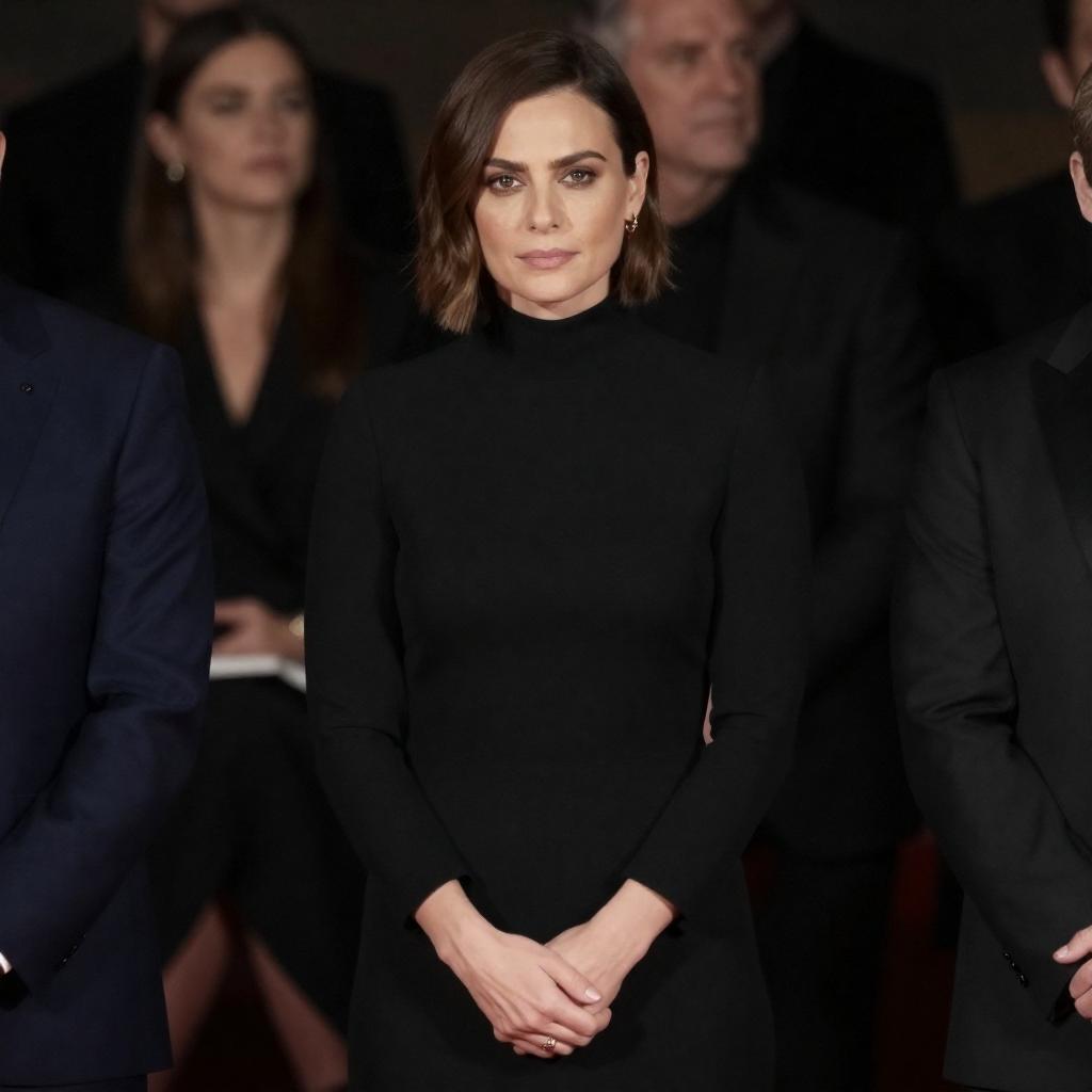 Photograph of a woman standing next to a black car, wearing a black dress and long black coat with gold buttons, and a statement necklace. She has light brown hair in a low bun, looking slightly upward. Background includes green shrubs and a concrete path. The car is partially visible on the left. She stands with her hands by her sides.