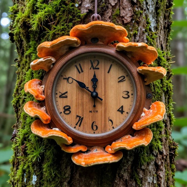 Photograph of a rustic, wooden clock with black hands and numbers, mounted on a moss-covered tree trunk in a forest. The clock's face is circular, with a natural wood texture, and surrounded by vivid orange, curled mushrooms that resemble a sunburst pattern. The clock hangs by a brown string, and the background shows blurred green foliage, enhancing the woodland setting. The clock's numbers and hands are bold and black, contrasting against the light wood and vibrant orange mushrooms.