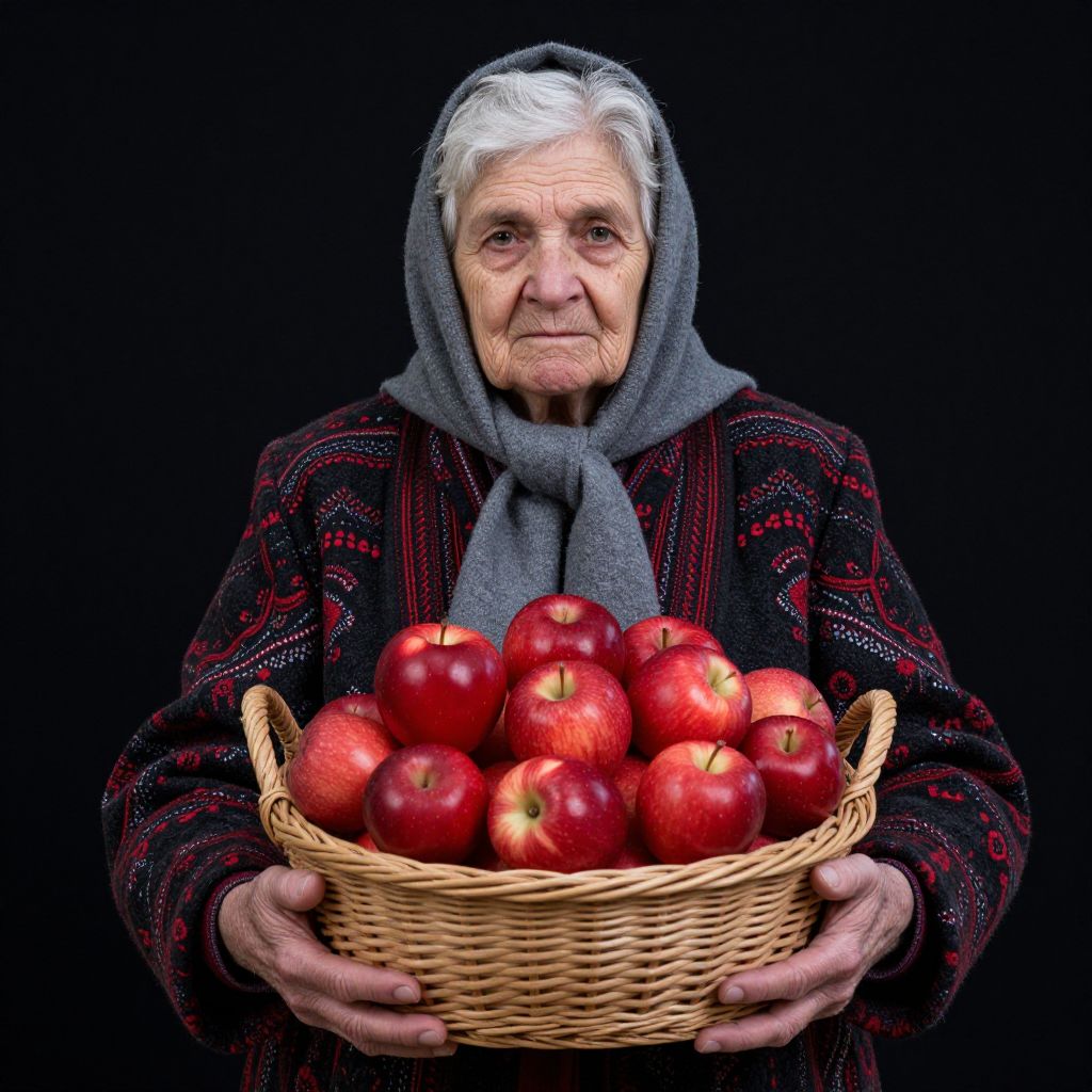 Photograph of an elderly woman with white hair, wearing a gray headscarf and a black patterned dress with red accents. She holds a wicker basket filled with bright red apples in both hands. Her expression is neutral, with deep wrinkles on her face. The background is solid black, making the woman and apples the focal point. The texture of her dress appears thick and woven, contrasting with the smooth, shiny apples. The lighting highlights the apples' vibrant red color and the woman's facial features. The overall composition is balanced and centered.