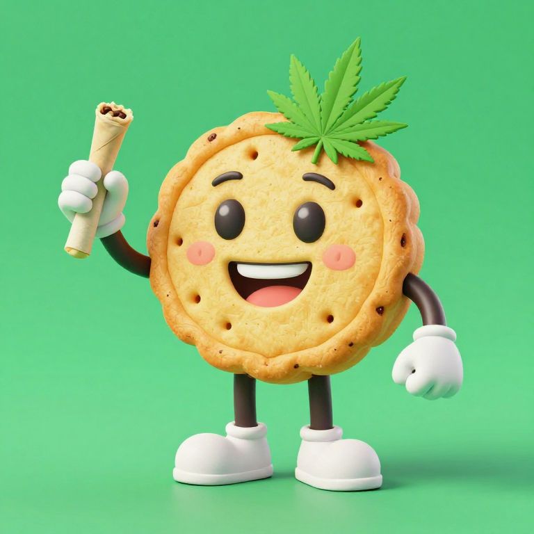 Retro-Inspired biscotti biscuit anthropomorphic character, cannabis leaf, kush, marijuana, happy, smiling, joint, 3d cartoon style, mascot,