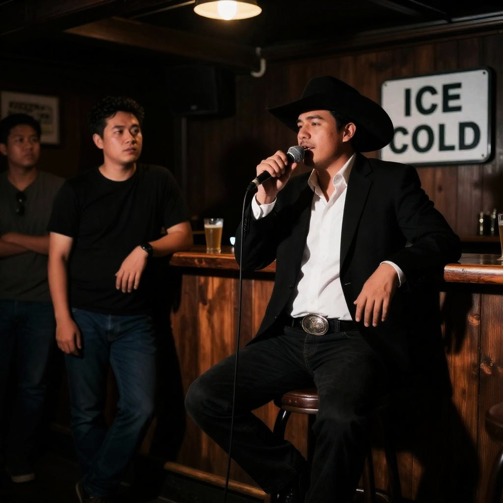 Man with dark hair, wearing a hat and leather jacket, sitting on a stool, singing into a microphone. Six people in the background, smiling and listening. Dimly lit room with red curtains, wooden walls, and framed pictures. Table with a red checkered cloth on the left. Warm, intimate setting.