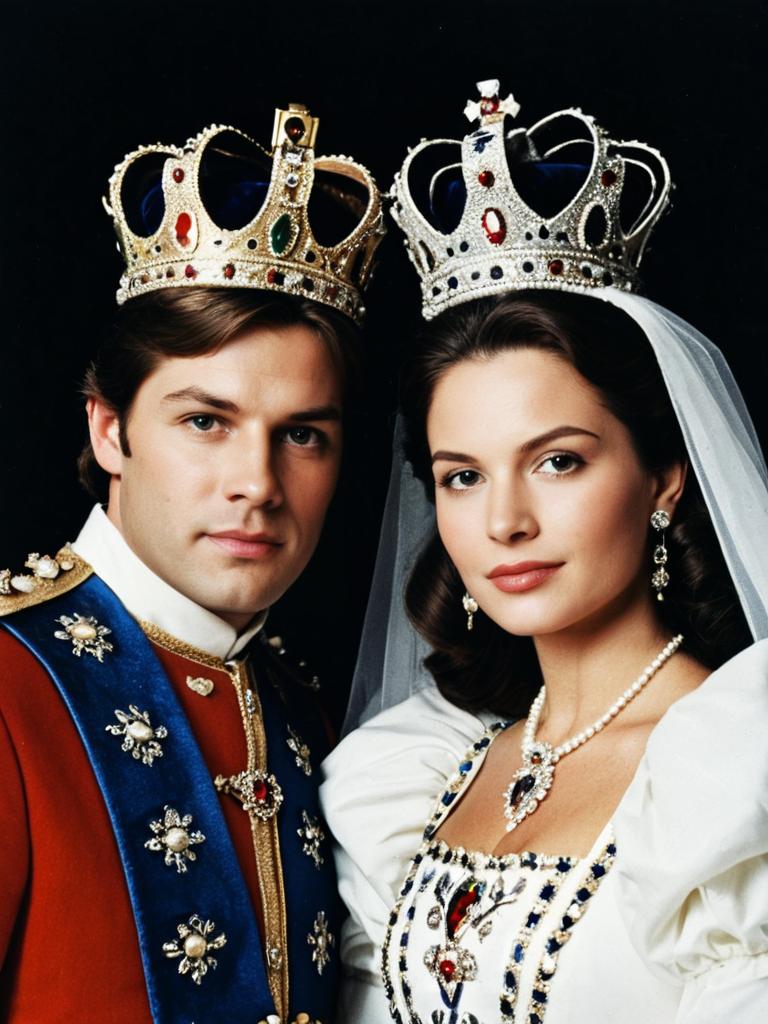 Couple in King and Queen Costumes, close-up romantic headshot, photorealistic realism