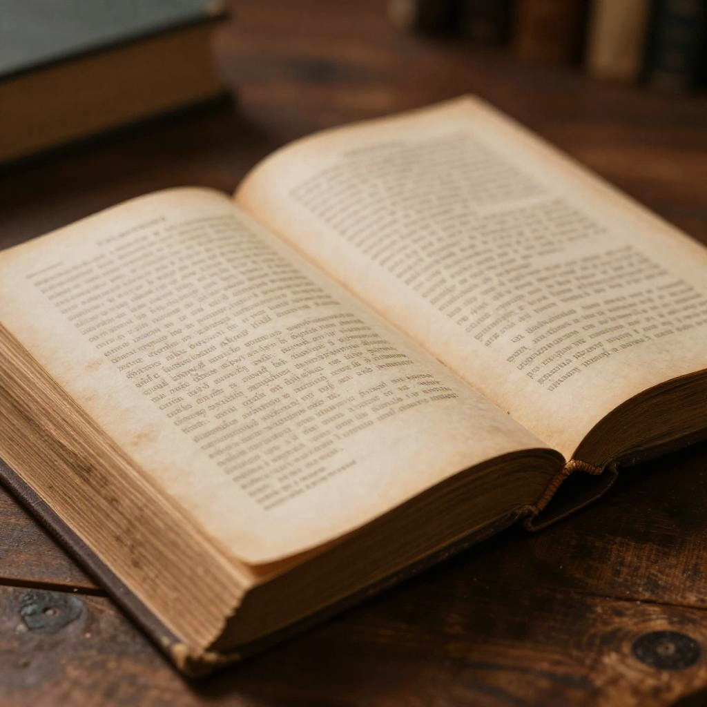 Realistic:ceum6oyxyle=, a detailed and ultra-realistic close-up of a weathered old book lying open on a wooden table, with visible textured pages, faint handwriting, and ambient warm lighting creating a cozy atmosphere