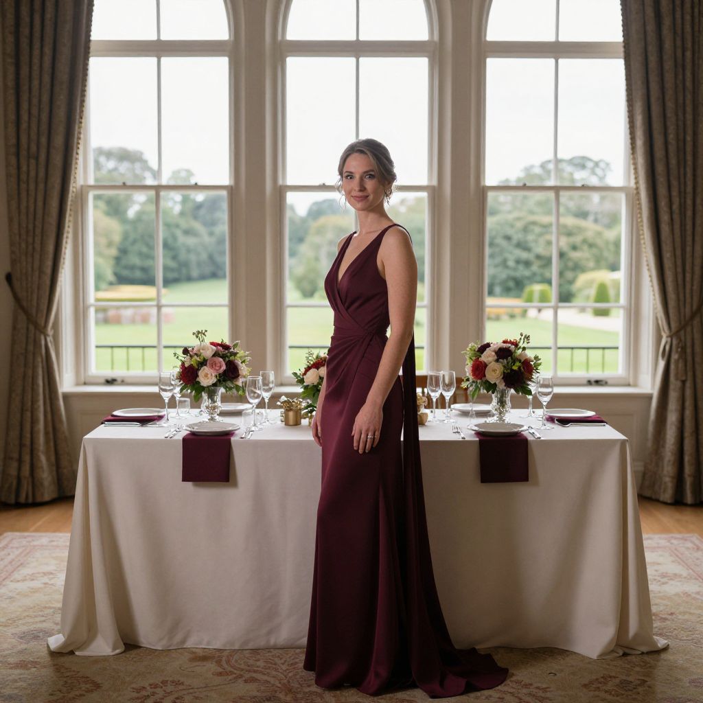 Elegant table setting featuring burgundy accents and floral arrangements complements a woman in a matching gown, captured against the backdrop of large windows at Delamere Manor.