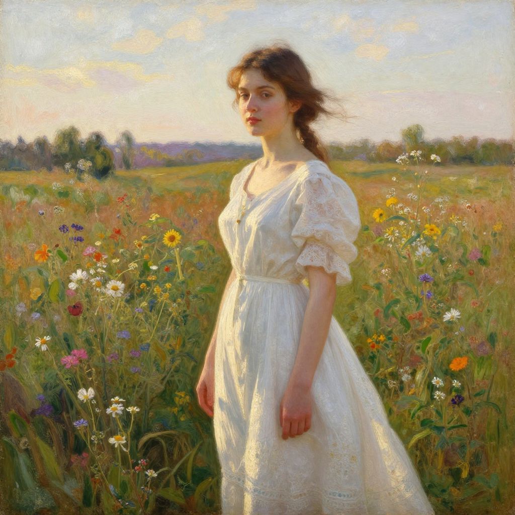 This is a digital painting of a young woman standing in a vibrant, sunlit meadow filled with colorful wildflowers. She has fair skin, brown wavy hair tied back, and is wearing a white, lace-trimmed, short-sleeved dress that flows gently in the breeze. Her expression is serene, gazing slightly to the side. The background features a soft, golden sunset sky and a distant treeline. The meadow is lush with green grass and an array of flowers in red, yellow, purple, and white. The painting style is realistic with a slight impressionistic touch, emphasizing light and color.