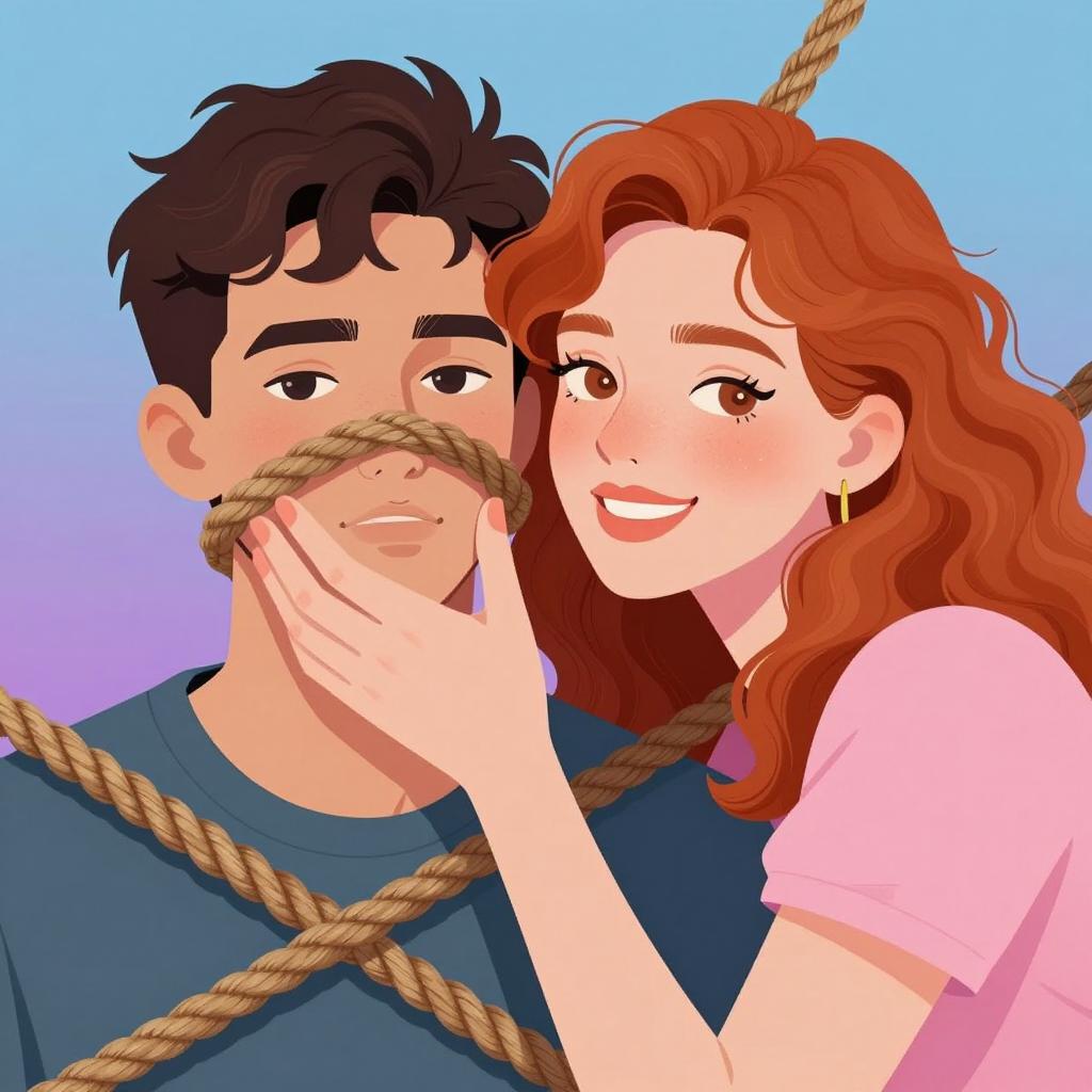 Illustration of two people on a ship's deck. Man on left wears white shirt, dark pants, white headband, holding rope. Woman on right wears red blouse, black skirt, white collar, holding rope, looking to the right. Blue sea in background. Ship's railing on right. Both stand near ropes and wooden structures. Bright sunlight. Man's arm tattoo visible. Clear sky.
