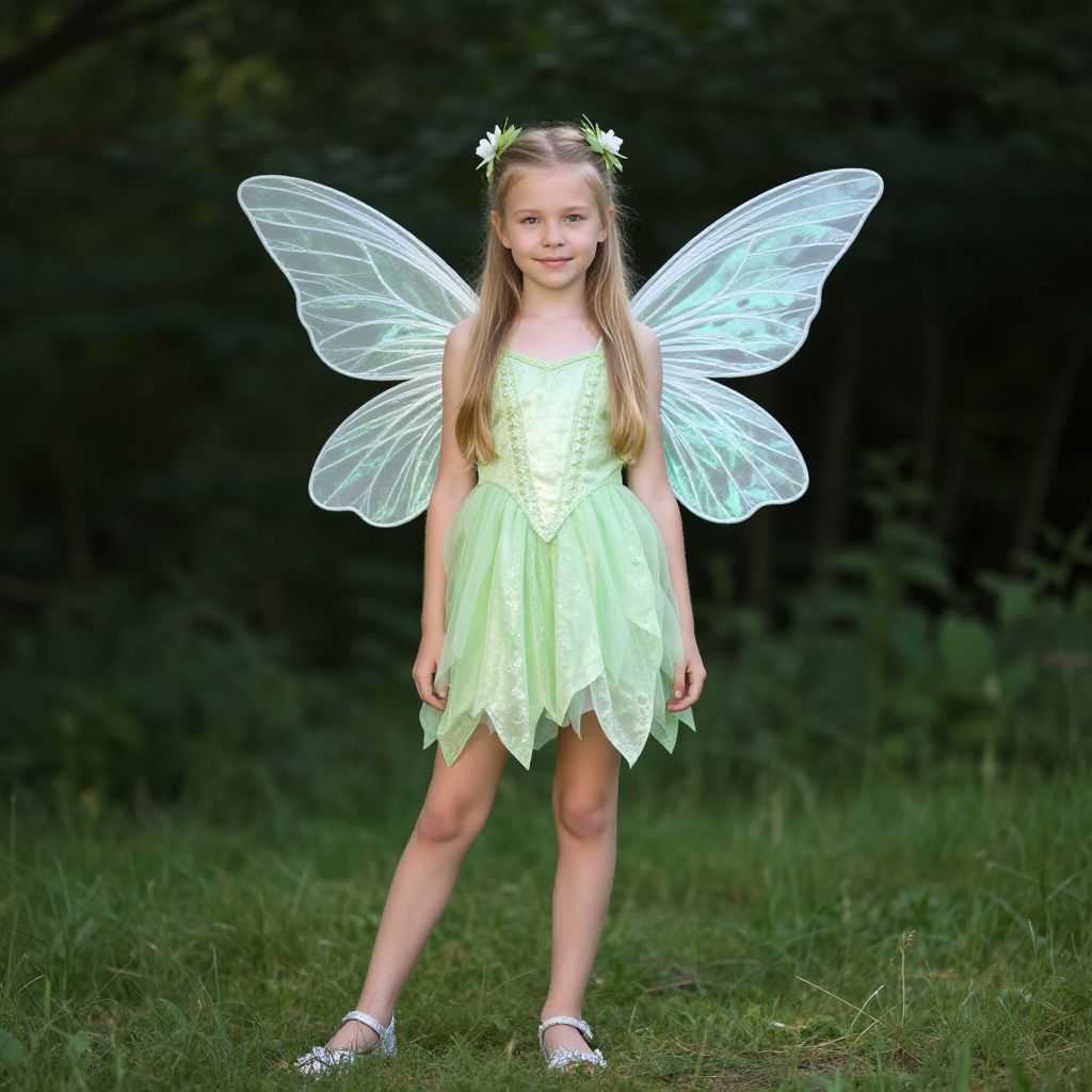 Photograph of a blonde toddler in a green fairy costume with transparent wings, antennae, green shorts, and boots, standing in a grassy me