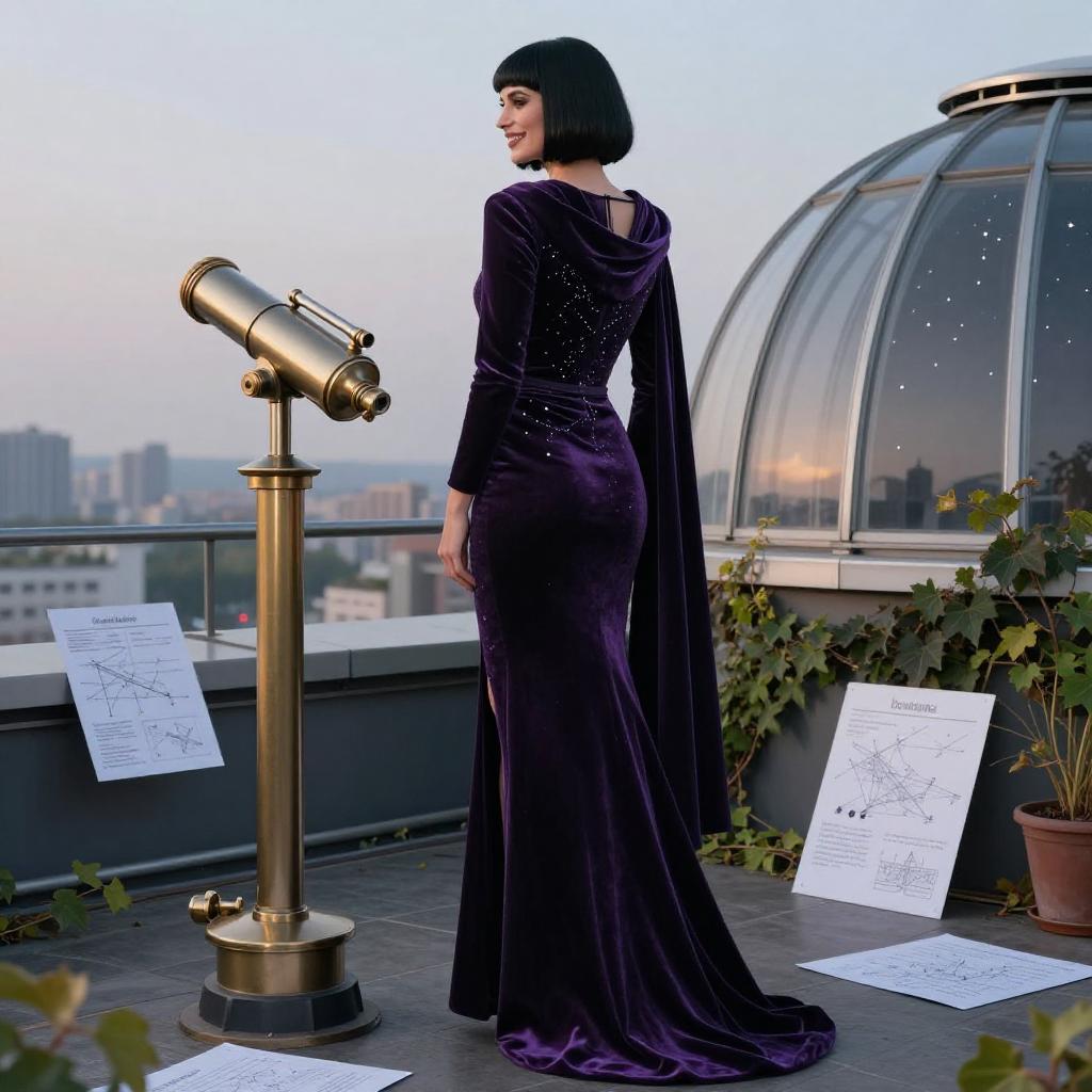 Masterpiece, best quality, (photorealistic:1.4), full body, ultra-detailed photo of a tall raven-haired woman with a sleek bob, wearing a tailored midnight-plum velvet gown with a detachable hooded cape, embroidered silver constellations tracing the spine, cinched waist, a thigh-high side slit and satin-lined hem, standing in a rooftop observatory terrace at dusk with brass telescopes, a domed glass annex, climbing ivy, scattered star charts and the first bright stars appearing over a quiet city skyline, smiling with an hourglass silhouette, viewed completely from behind