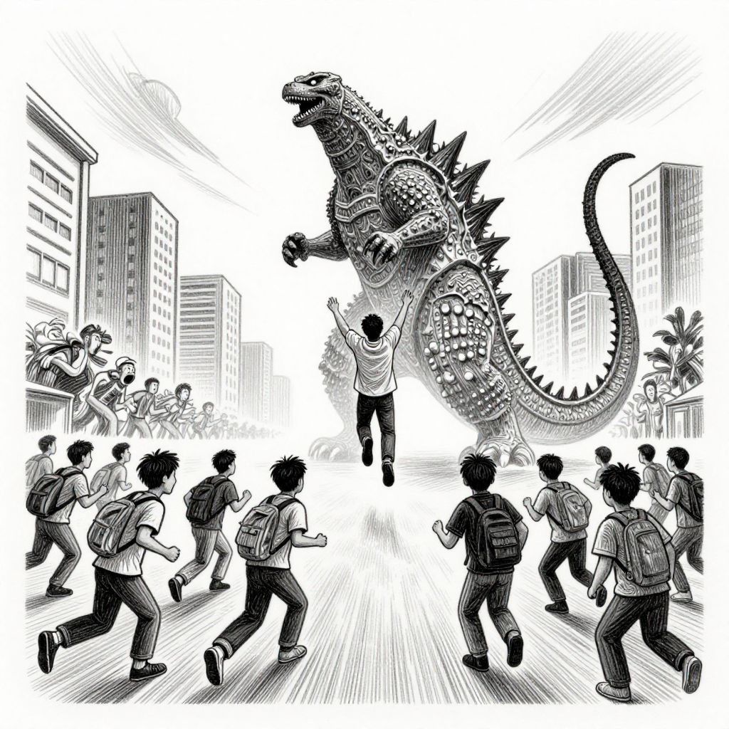 Black-and-white manga-style drawing of schoolchildren running from a giant, spiky, textured Godzilla in a cityscape with tall buildings.