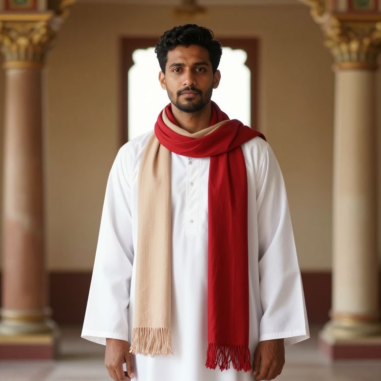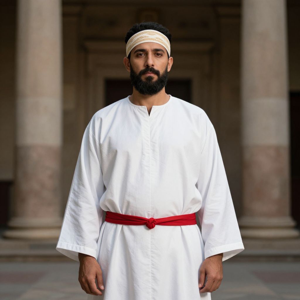 A man with a beard and mustache is wearing a white robe with a red belt around his waist. He has a headband on his head and is standing in front of a building with columns.