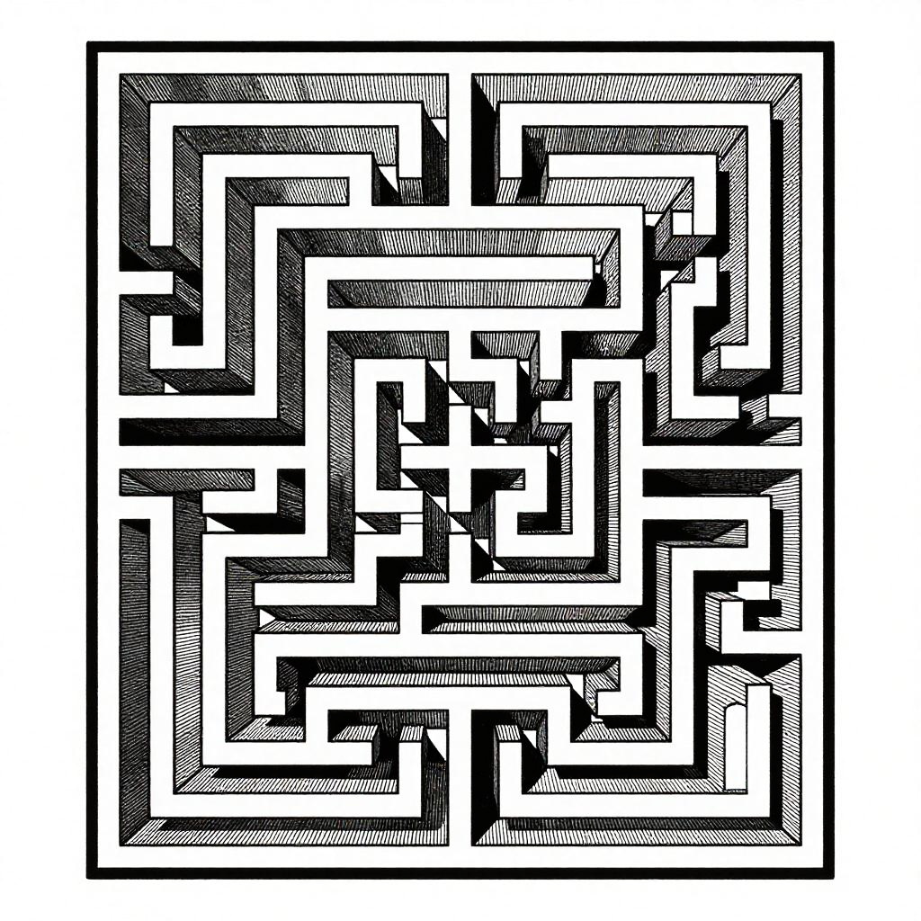 Escher labyrinth, a complex network of stairways and pathways defying logic, black and white surreal architecture, fine line art emphasizing repeating patterns and impossible structures, creating an intriguing visual puzzle that challenges perception and spatial reasoning.