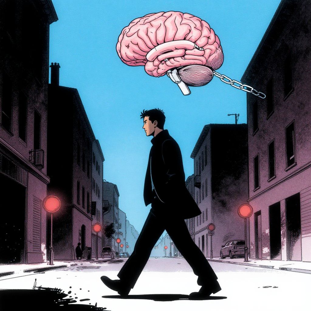 Digital comic-style drawing: man in black coat walks down urban street with floating pink brain and chains above his head. Blue sky, red streetlights,