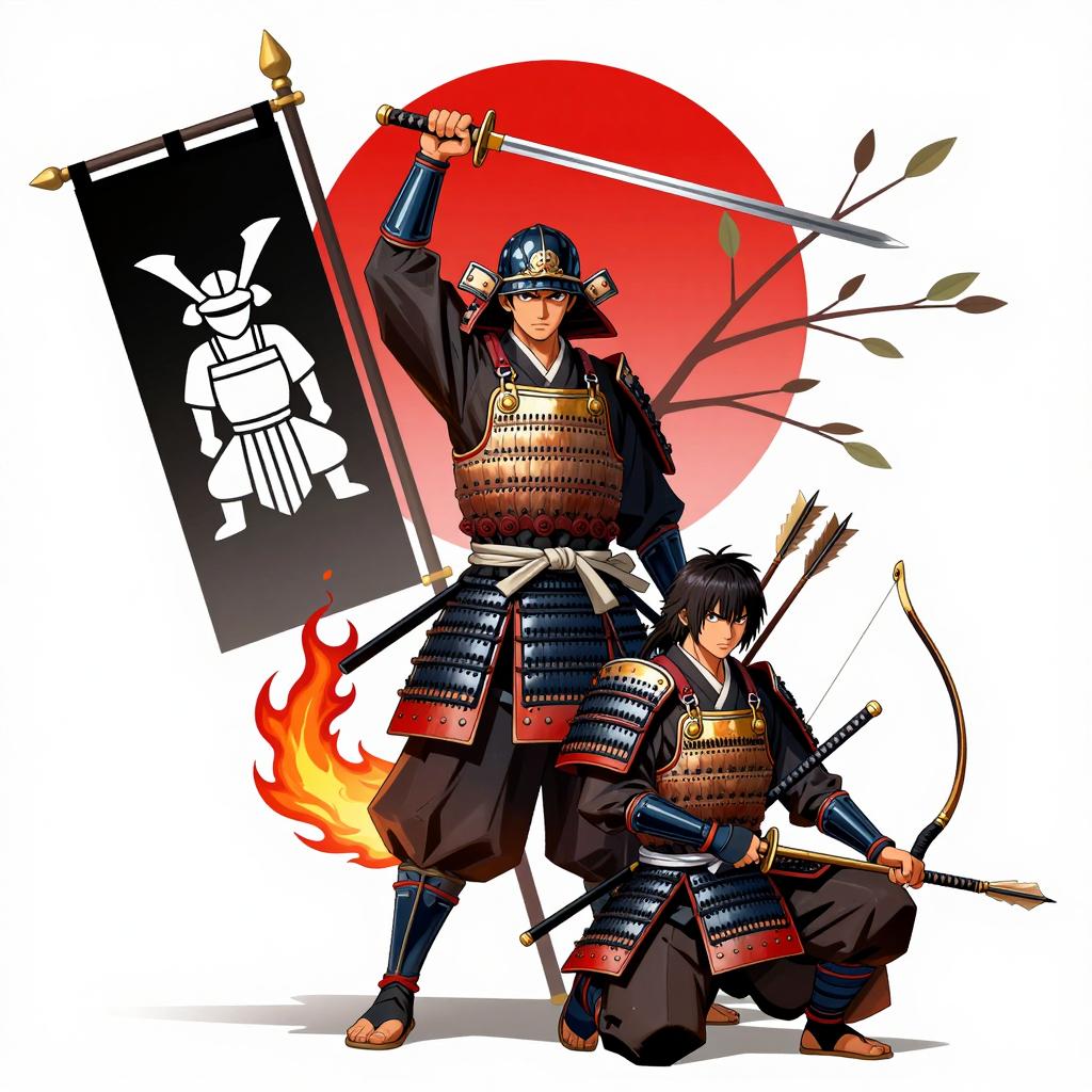 Illustration of two samurai warriors in detailed armor, one standing with a raised sword and fiery tail, the other kneeling with a bow. Bright red sun disk in the background, black flag with white samurai design on the left. Both warriors have intense expressions. Samurai in front has short hair, standing samurai has longer hair. Multiple arrows and samurai swords in hand. Branches with leaves on the top right.