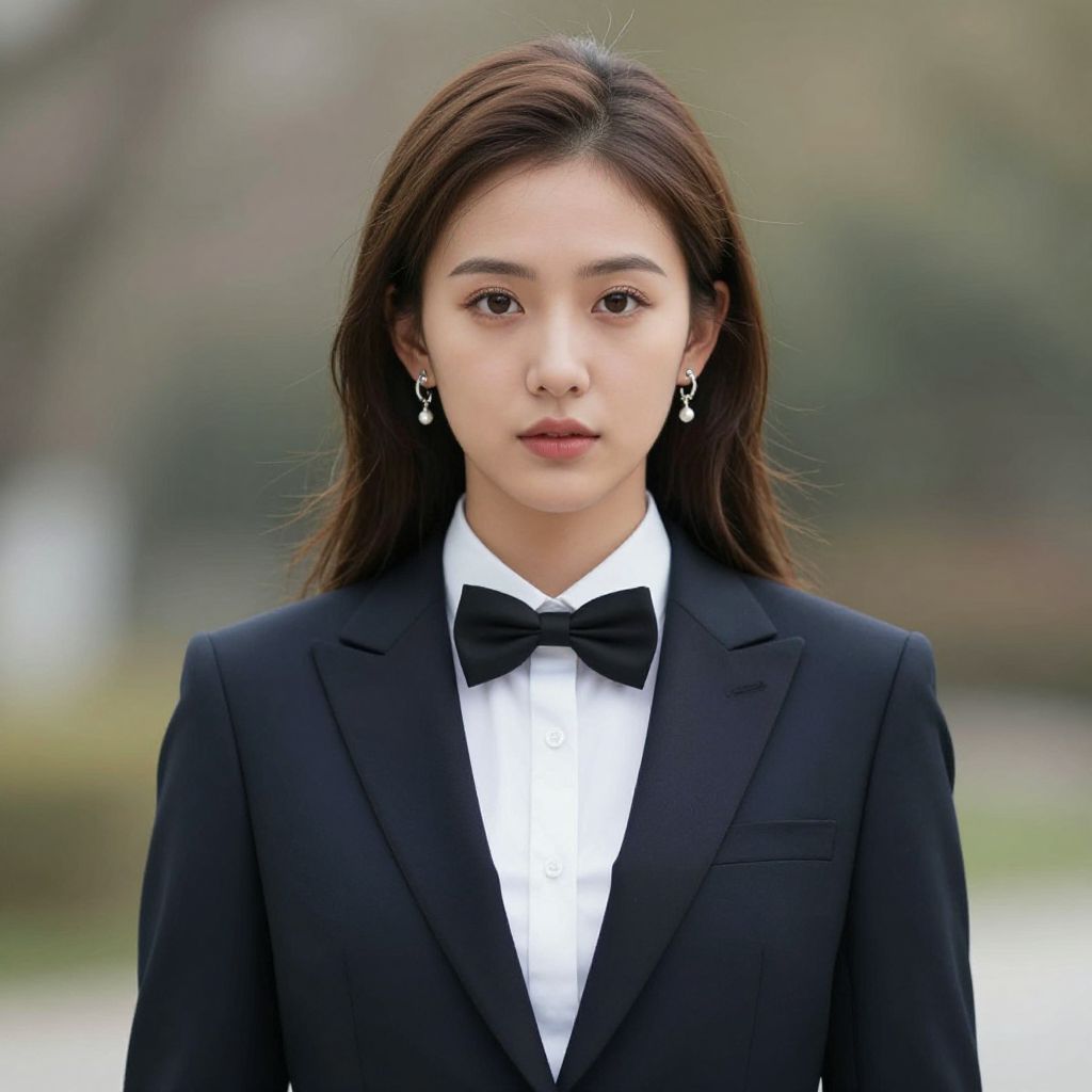 Photograph of an Asian woman with fair skin and long, straight, dark brown hair. She is wearing a black tuxedo with a white dress shirt and a black bow tie. Her expression is neutral, with slightly parted lips and dark, almond-shaped eyes. She has small, dangling earrings. The blurred background features green and brown hues, suggesting an outdoor setting. The overall style is formal and elegant, with a focus on the subject's attire and poised appearance. The lighting is natural, highlighting her facial features and the texture of her hair.