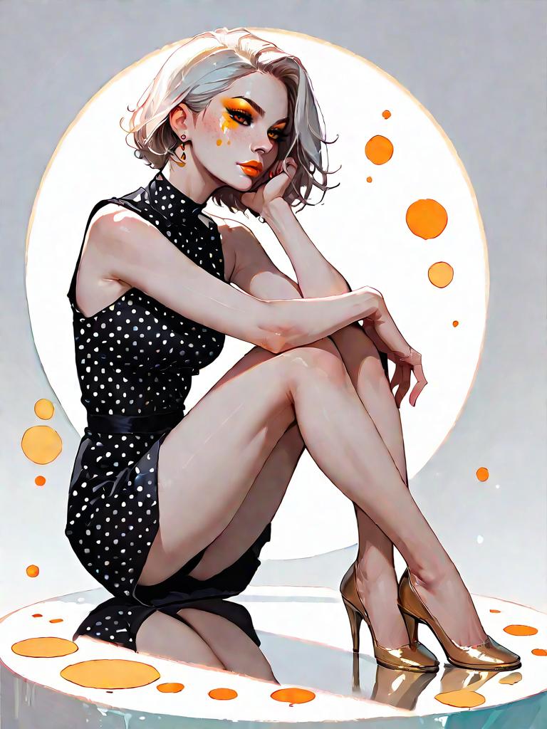 Digital illustration of a stylish woman with short silver hair wearing a sleeveless black mini dress adorned with gold polka dots. The dress features a mock neckline, fitted bodice, and a flounce hem. The woman is seated in a contemplative pose, wearing shiny gold high heels. The background is a plain white studio setting with orange circular accents.