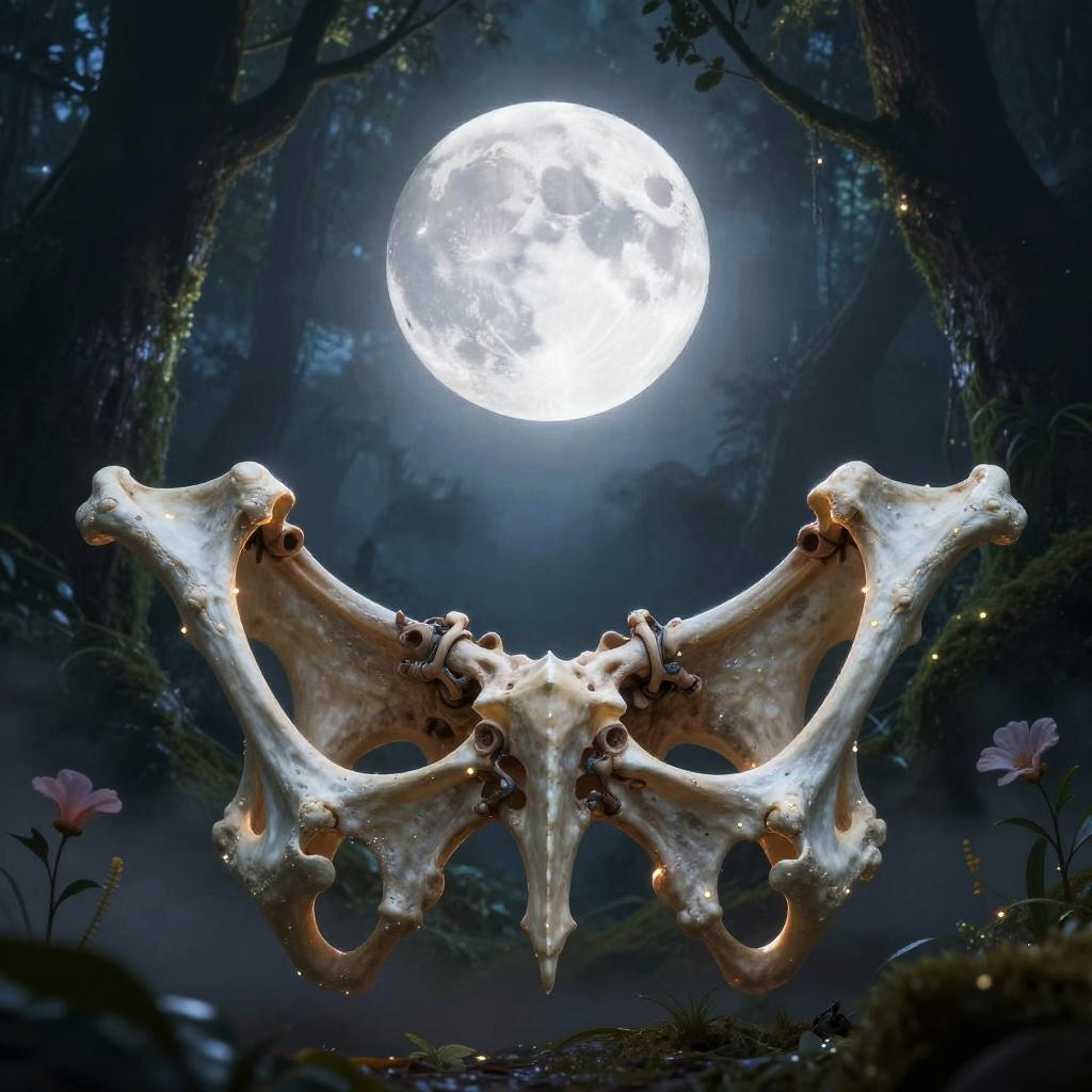 Artistic depiction of collarbones illuminated by ethereal moonlight, featuring a mystical, fantasy forest backdrop with mist and delicate floral elements, blending organic forms with subtle, luminous highlights.