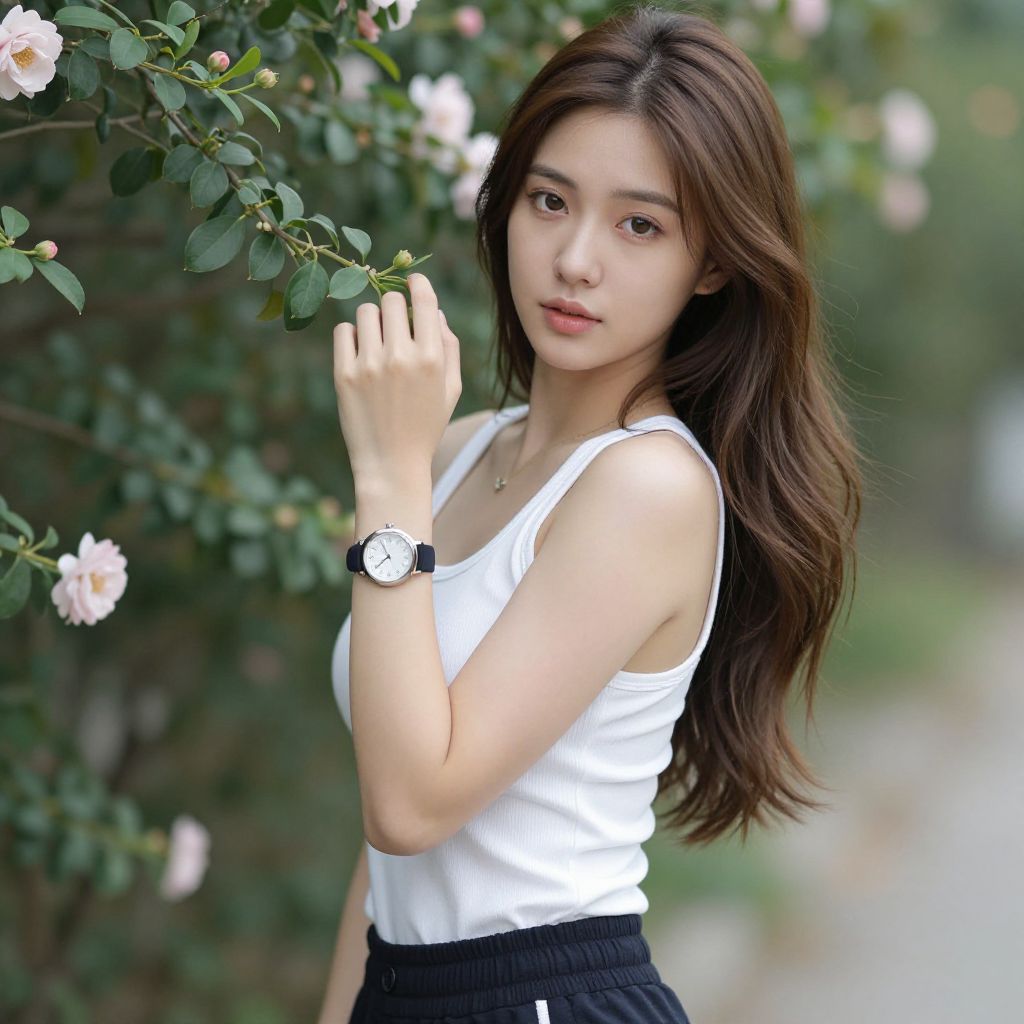 "activewear clothing, 1girl, solo, long hair, brown hair, pants, tank top, watch, brown eyes, wristwatch, lips, realistic, looking at viewer, flower Realistic photo of casual sexy person with pretty face"