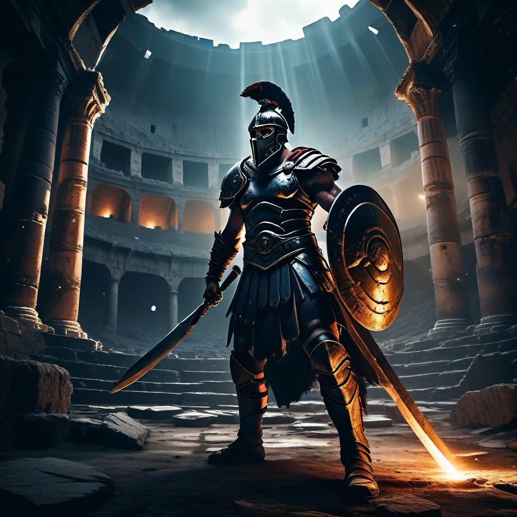 A fierce gladiator, in the middle of a crumbling ancient coliseum, glowing in the darkness, ominous and atmospheric