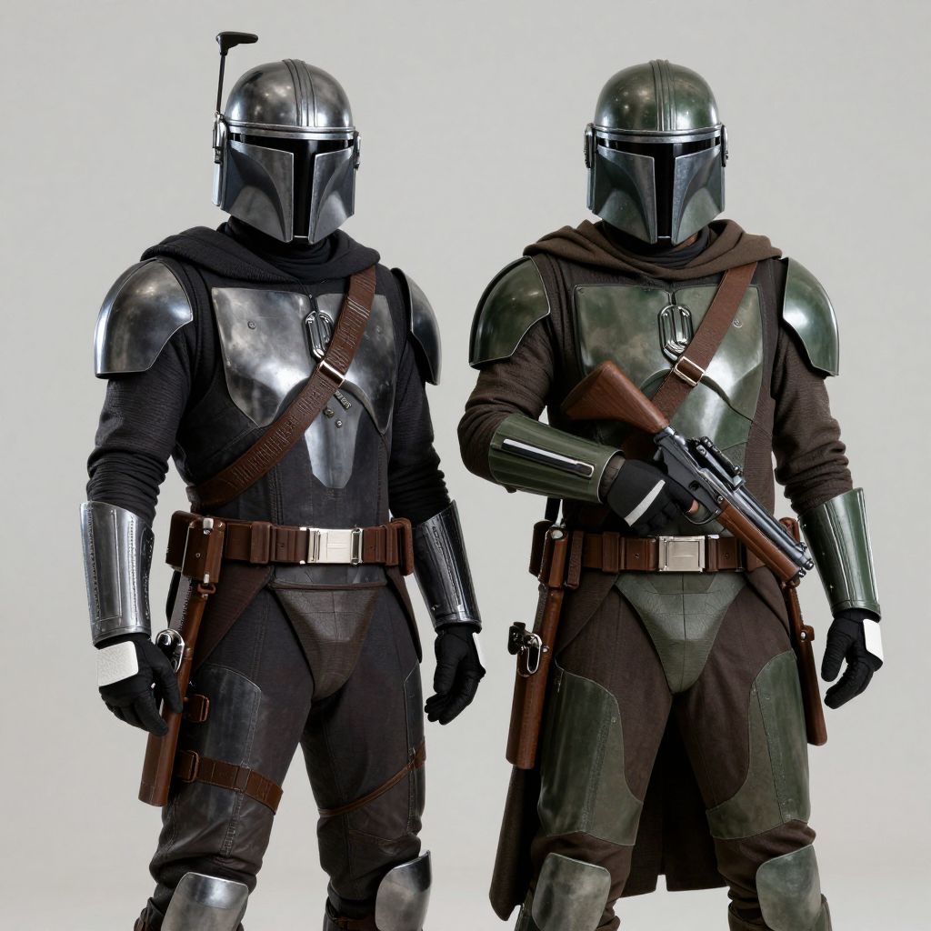 Photograph of two Mandalorian Stormtroopers in shiny metallic armor and dark brown cloaks, one with a rifle, standing side by side against a